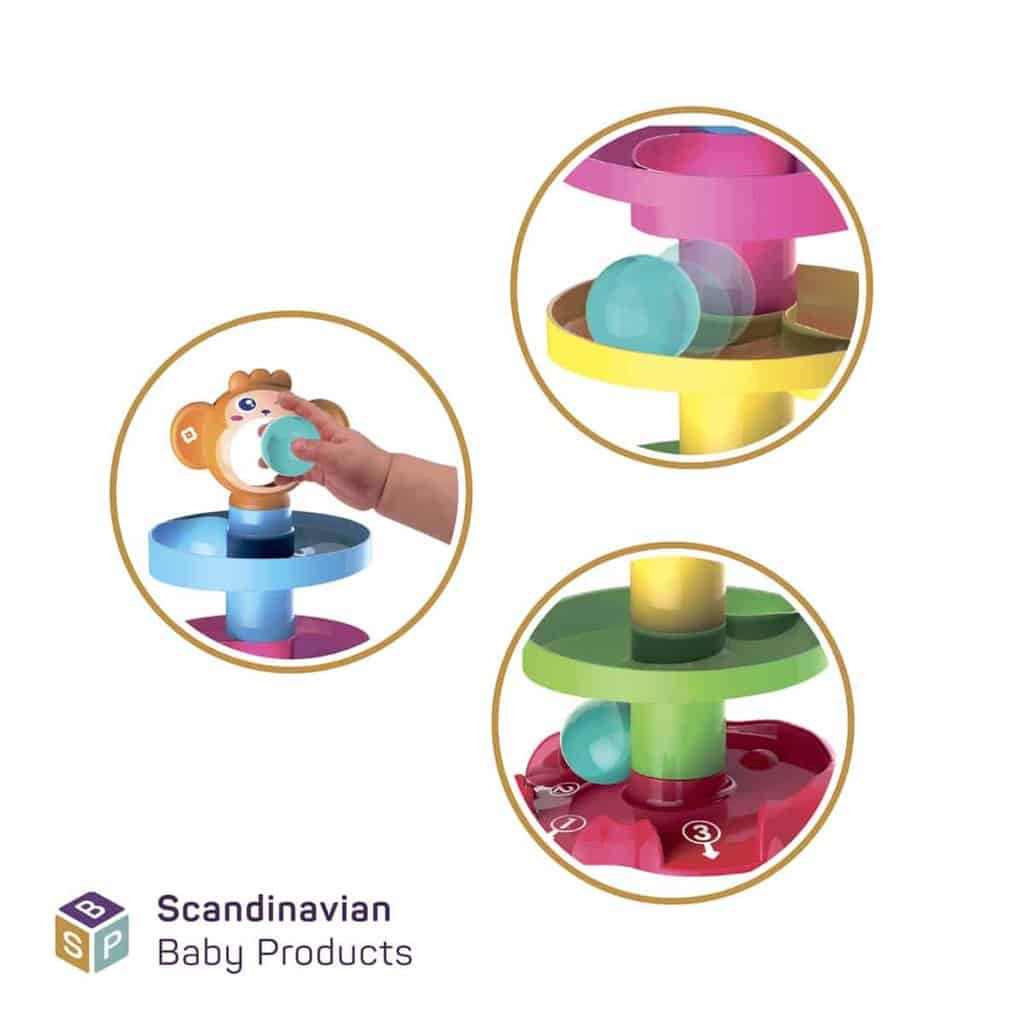 Sjov abe-kuglebane fra Scandinavian Baby Products. Let at samle, hvorefter barnet kan slippe boldene løs via abens ansigt. Herefter suser boldene rundt i cirkler for til sidst at ende på gulvet med god fart. Inspirerer barnet til at kravle og bevæge sig efter boldene.