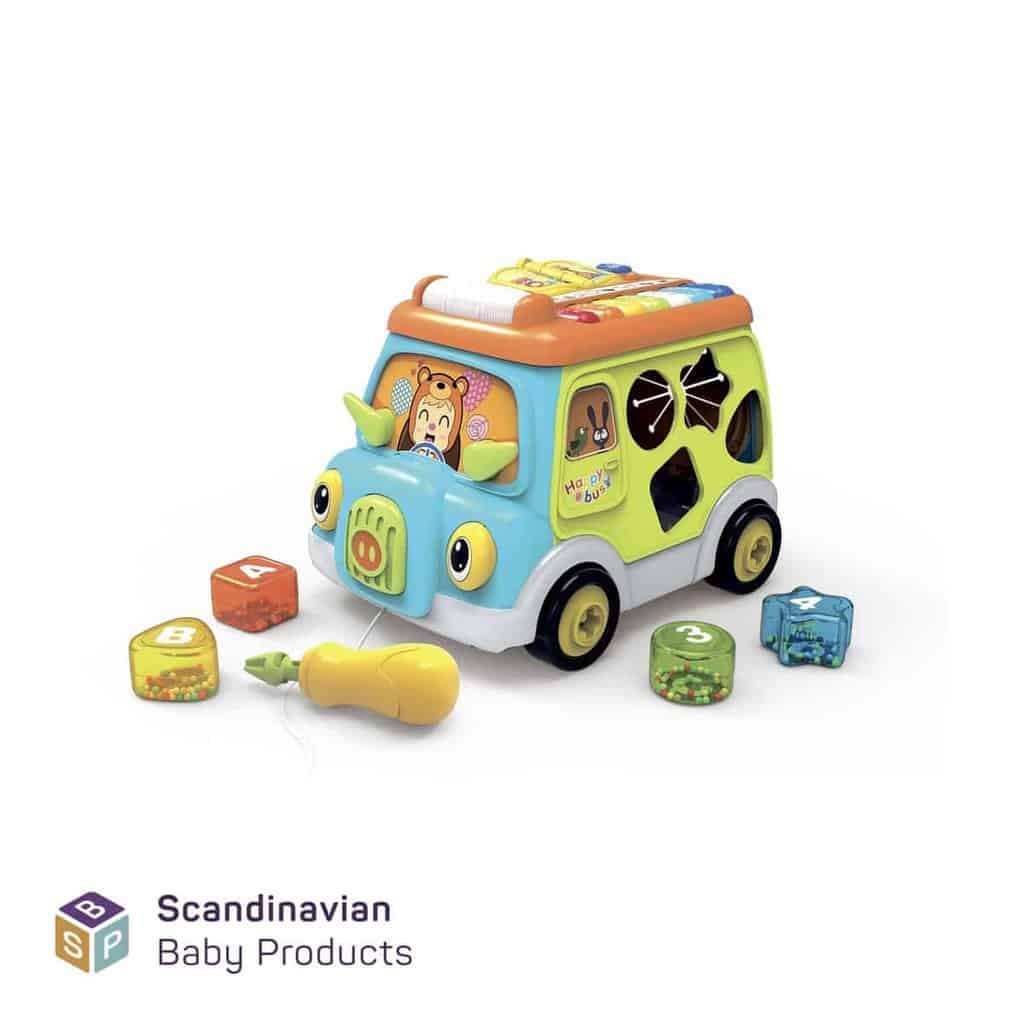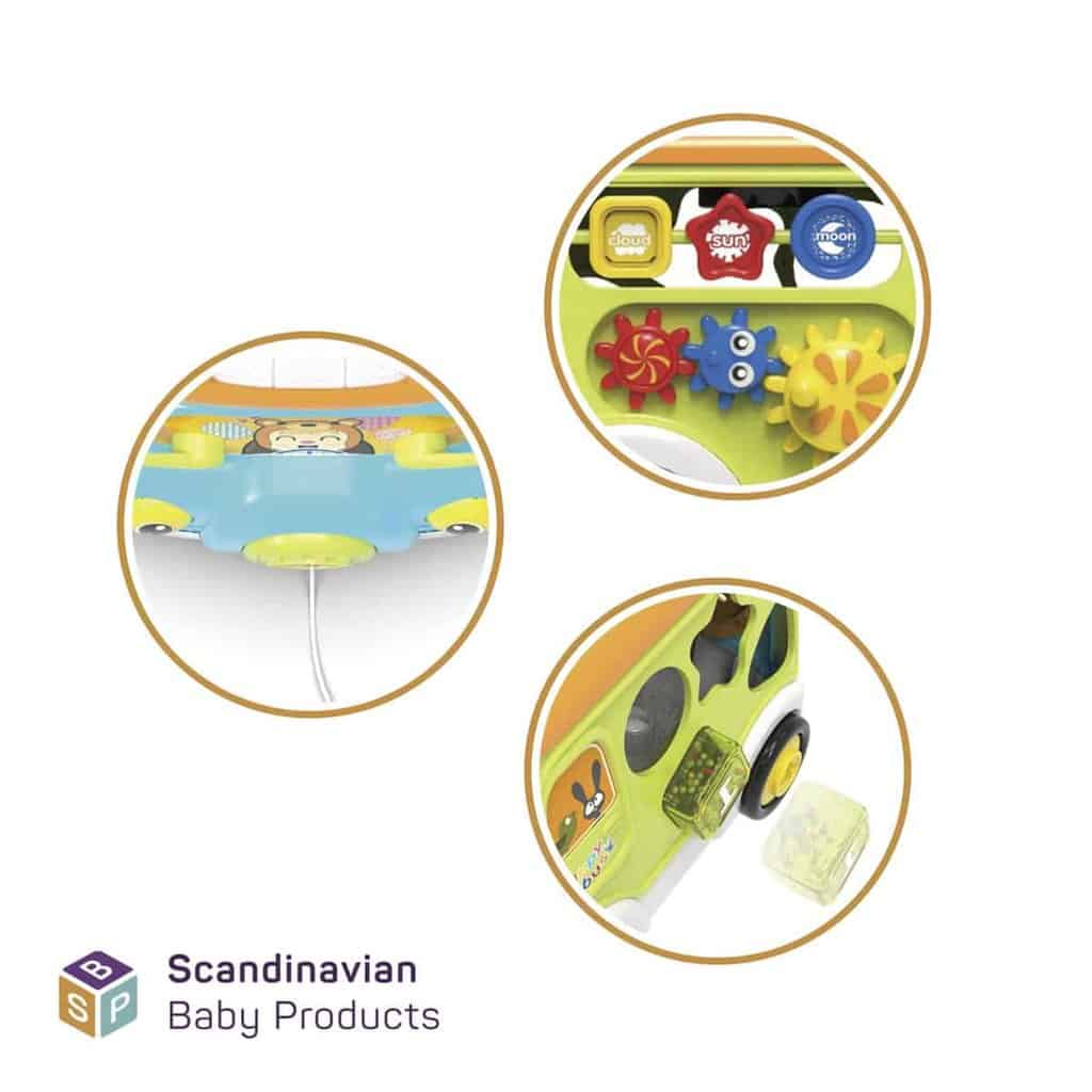Sjov og lærerig aktivitets-bus fra Scandinavian Baby Products. Bussen har mange funktioner: put-i-hul kasse, spil sjove melodier, spil klaver, skru hjulene af med den tilhørende skruetrækker eller træk bussen efter dig. Batterier isættes øverst på bussens tag ved at fjerne lågen med en rigtig skruetrækker. Dette skal håndteres af en voksen, og lågen skal lukkes korrekt efter batteriskift.