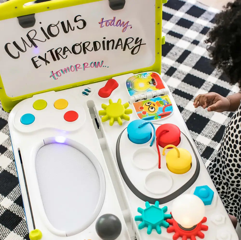Dette aktivitets-videnskabs-bord vil holde den lille beskæftiget i timevis. Bordet indebærer aftagelige, roterende gear og farveopdagelseskredsløb samt blinkende lys. Forbind de forskellige gear og få det til at lyse. Aktivitetsbordet spiller mere end 65 melodier og introducerer dit barn for 3 forskellige sprog, herunder: Engelsk, spansk og fransk. Lydstyrken kan justeres til enten høje eller lave indstillinger og kan også slukkes helt. Dit barn vil få en kæmpe musikalsk oplevelse ud af dette videnskabsbord. Benene kan tages af, så selve borddelen kan anvendes til sjov og leg på gulvet.