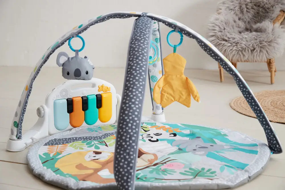 Aktivitetsstativ med klaver fra Scandinavian Baby Products. Stativet indeholder fire stykker spændende aktivitetslegetøj. Dasker din baby til klaveret med sine fødder eller hænder, spiller klaveret sjove melodier, toner og lyde. Aktivitetsstativet er monteret på et blødt legetæppe med et flot dyremotiv.
