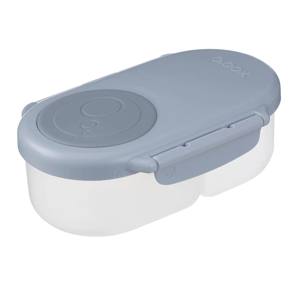 Snackbox – Smidig mellemmåltidsløsning til små maver På farten? b.box gør mellemmåltidet nemt med sin alsidige snackbox! Perfekt til mindre portioner, så de små altid er mætte og tilfredse – uanset om det er legepladsen, bilturen eller børnehaven. Fleksibelt frugtlåg holder små hele frugter på plads – ingen flere mosede eller skårne frugter! To lækagesikre rum som gør det trygt at pakke våde snacks som yoghurt, puré og dips. Letåbneligt låsespænde som er tilpasset til små hænder. Aftagelige tætninger for nem og hygiejnisk rengøring. Sikker & nem at rengøre: Tåler opvaskemaskine (øverste hylde) Fremstillet af PP og silikone Fri for BPS, PVC, BPA & ftalater Specifikationer: Mål: 11cm (L) x 16,5cm (B) x 6,1cm (H) Kompakt størrelse som passer i b.box madkasse