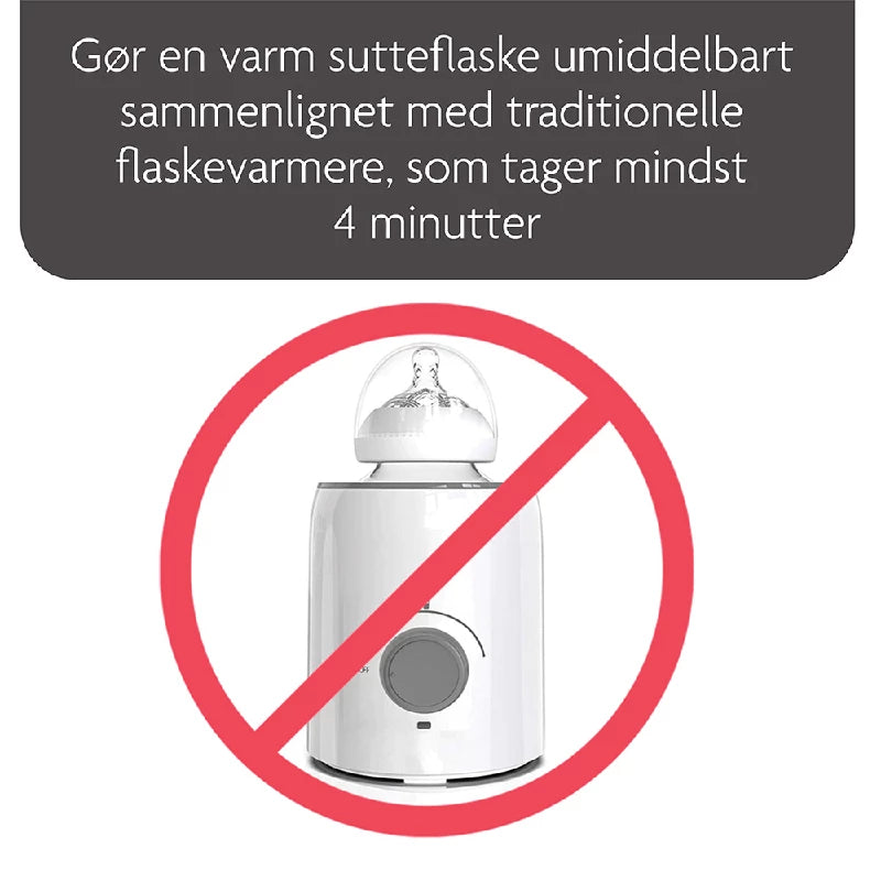 - Laver varme flasker MED DET SAMME uden at vente 3-5 minutter, som det er typisk for en traditionel flaskevarmer.