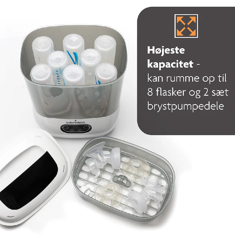Baby Brezza Sterilizer Dryer Advanced er den mest avancerede måde at sterilisere og tørre sutteflasker, brystpumpedele og tilbehør på. Denne revolutionerende maskine dræber 99,9 % af alle bakterier med naturlig damp og tørrer derefter automatisk 33 % hurtigere. Den har den største kapacitet af alle sterilisatorer på markedet og kan rumme 8 flasker, 2 komplette brystpumpesæt, sutter og tilbehør fra alle mærker. HEPA-filteret sikrer, at den tørrer med 95 % bakteriefri luft. Den er også modulopbygget, så du kan bruge den på 4 forskellige måder, og den har 4 forskellige funktioner: Sterilisering og tørring, Kun Sterilisering, Kun tørring eller Opbevaring. Nu kan du sterilisere og tørre flasker og alt tilbehør på en ENKEL måde! BPA-fri. 2 års garanti.