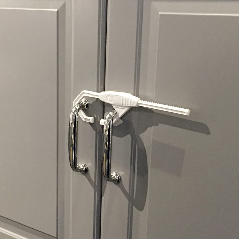 Håndtag og greb er fristende for børn. Lågesikring fra BabyDan sikrer dit skab mod små pilfingre. Låsen er perfekt til praktisk dobbeltlågesikring, hvor der er lodrette håndtag på køkkenskabe eller køle/fryseskabe. Hurtig og nem montering – og skabet er forsvarligt sikret. En voksen, kan med en hånd afmontere låsen – og der igen er adgang til skabet.