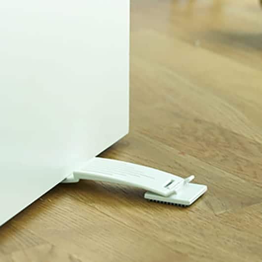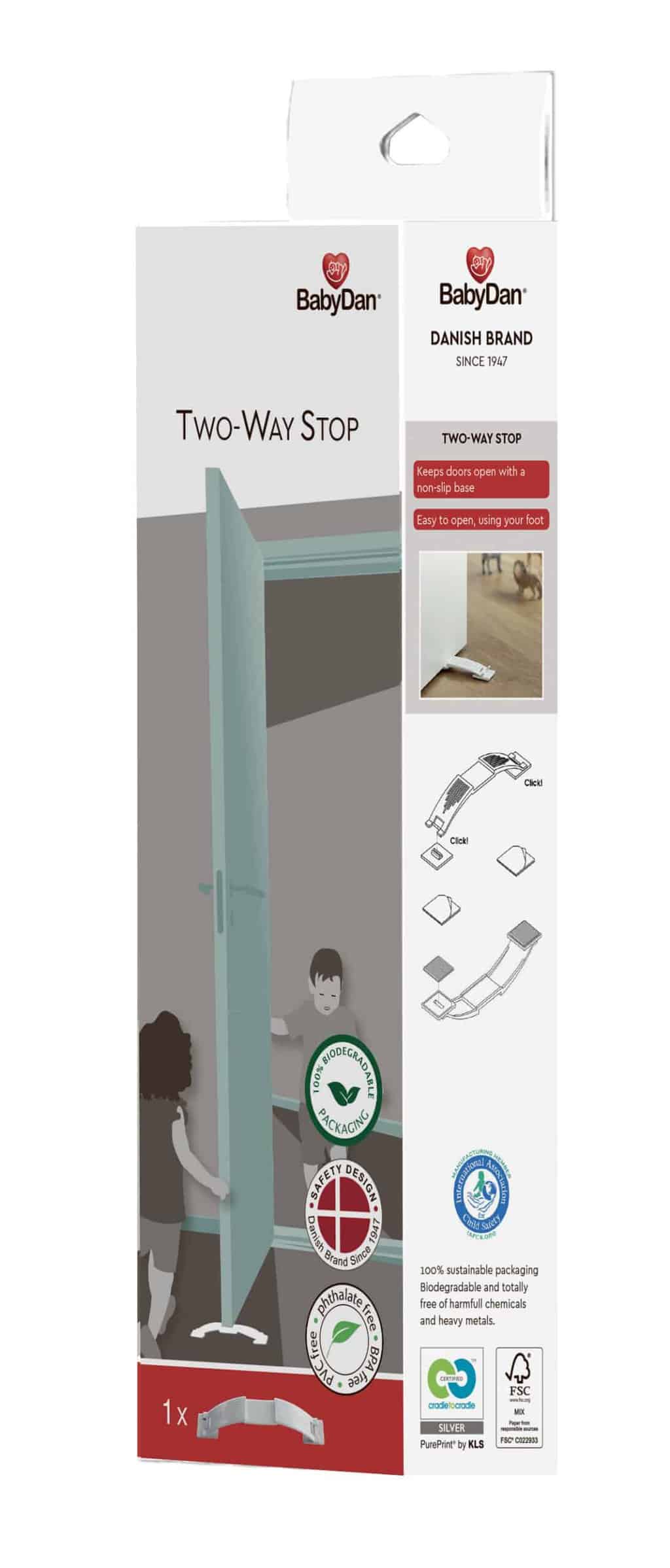 Med To-Vejs Stop kan du kan undgå, at dit barn får fingrene i klemme. Du kan placere og udløse dørstopperen ved at træde på den ene side af dørstopperen afhængigt af, hvilken vej du vil åbne eller lukke døren. Den holder døren i en sikker position, fordi gummifødderne holder dørstopperen på plads på næsten alle slags gulve. Dørstopperen er i en 100% bionedbrydelig emballage og er Cradle to Cradle certificeret. Det betyder, at emballagen vil blive nedbrudt naturligt, når du smider den ud, så den efterlader ingenting, som kunne skade vores planet. På den måde kan du beskytte din lille guldklump fra ulykker og tage ansvar for den verden, som dit barn vokser op i.