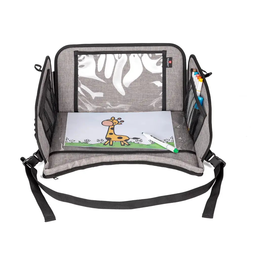 De praktiske elastiklommer i forskellige størrelser kan holde alt fra farveblyanter og tuscher til små bøger og snacks. En stor lynlåslomme på undersiden af bakken og en stor plastiklomme lige foran barnet giver også rig mulighed for at medbringe et helt lager af papir, tegninger og bøger til turen.