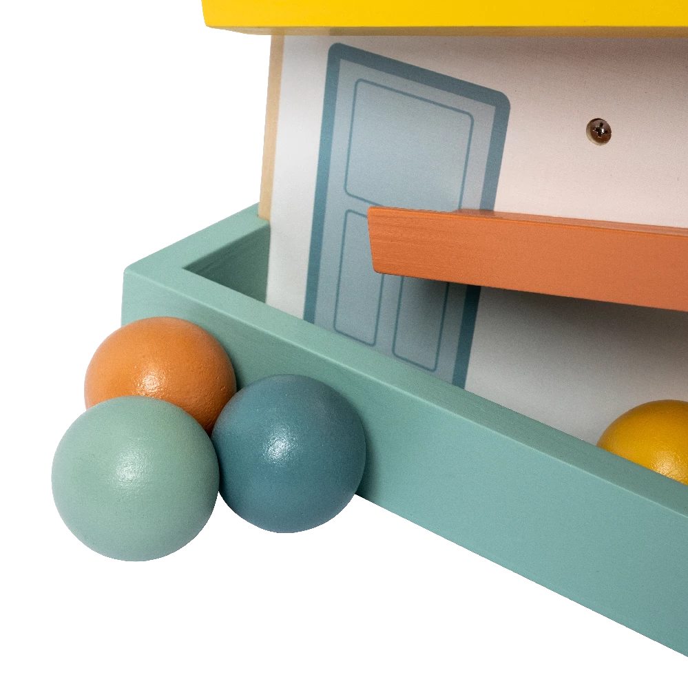 Kuglebanehuset er en spændende labyrint af leg og opdagelse, hvor børnene kan følge kuglernes zigzag-bevægelser gennem banen. Med 5 forskellige ramper og 4 huller skal kuglerne navigere gennem en række udfordringer for at fuldføre banen. Denne aktivitet fremmer ikke kun fantasien, men også øje-hånd-koordination, nysgerrighed og forståelse af årsag og virkning.