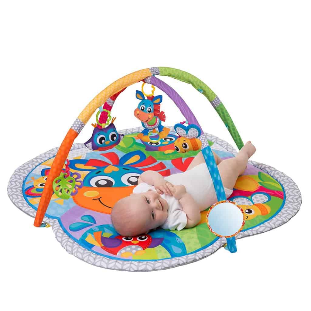 Aktivitetstæppet har små rangler hængende som er fantastisk til legetid og tilbyder funktioner såsom musik, pibelyde og knitrestof. Der er også spejl inkluderet.