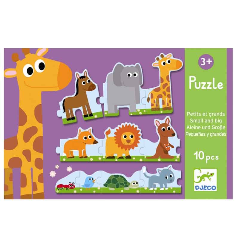 Djeco Lærespil - Stor og lille, et flot og lærerigt spil for de mindste. Her skal de finde ud af, hvilket dyr der er mindst til størst, og sætte dem i rigtig rækkefølge. 10 brikker i alt.