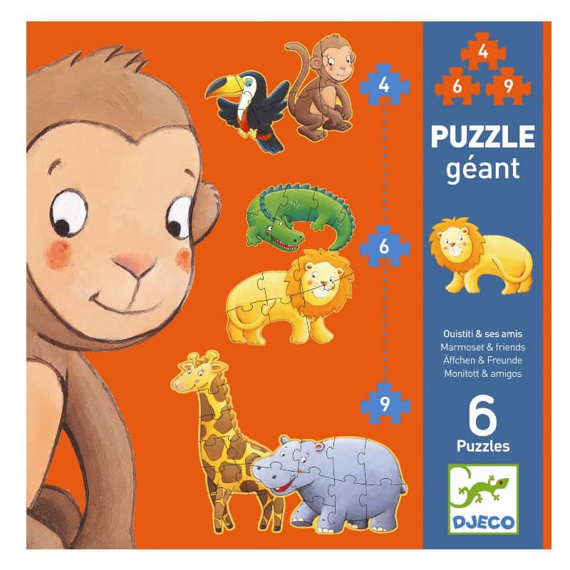 Djeco Marmoset og hans venner, super flot æske, med hele 6 puslespil i æsken. Forskellig sværhedsgrad. 2 vilde dyr består af hver 4 brikker, 2 af hver 6 brikker og 2 af hver 9 brikker.