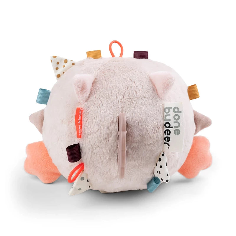 Puffee aktivitetsbolden inviterer nysgerrige øjne og små fingre til at udforske de mange sensoriske funktioner. Hold fast i Puffees bløde pigge og finner og lyt til de spændende knitrelyde. Mærk de forskellige strukturer, og udforsk de farverige mærker. Puffees runde form er perfekt til rul. Puf til den og hør den spændende lyd, der opfordrer de små til at kravle efter den. Silikone bideringen, formet som Puffees halefinne, har forskellige strukturer til at stimulere og berolige gummer som klør. Den skøre kuglefisk er i et mix af pudder og koral rød og har mange funktioner, der stimulerer fin- og grovmotorikken. Elastikken gør det let at fastgøre den til en legemåtte, klapvogn eller aktivitetscenter ved hjælp af en legetøjsring.