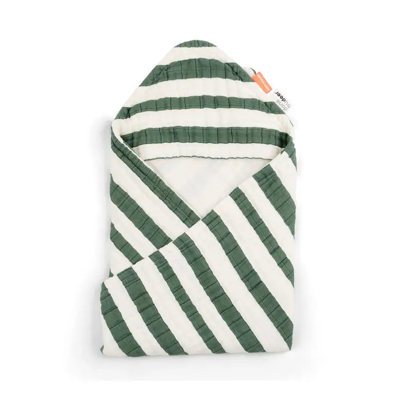 Det stribede håndklæde med hætte er perfekt til at pakke din baby ind i, så barnet bliver tør og lun efter et dejligt bad. Det bløde håndklæde i økologisk bomuld er i flere lag, der gør det let og rart mod huden og gør at det tørrer hurtigt. Brug det fine og behagelige håndklæde ved badetid, babysvømning eller på en strandtur. Håndklædets hætte sørger for at vand ikke løber ned fra håret mens kroppen tørres. Det hyggelige og bløde sandfarvede babyhåndklæde med hætte er dekoreret med brede grønne striber.