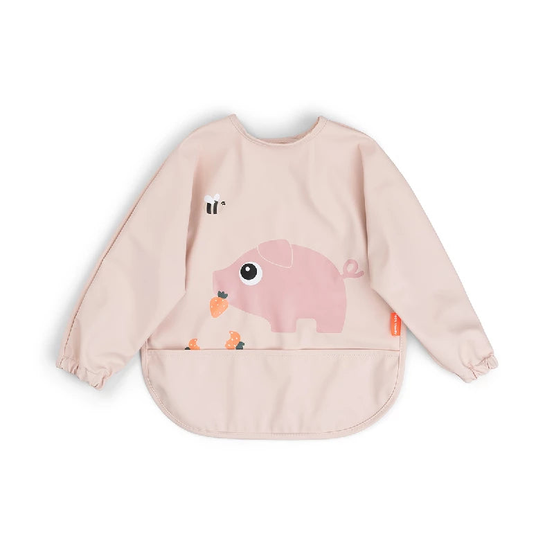 Hagesmæk med ærmer og en lomme til at fange tabt mad
