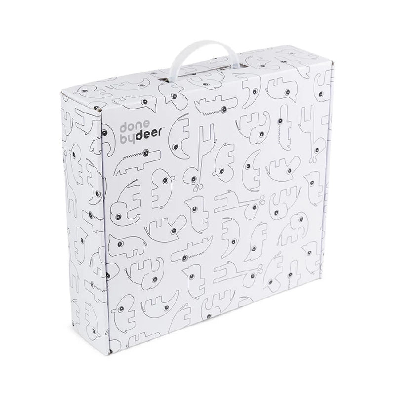 I spisetid goodie boxen har vi pakket fem af Done by Deers bestsellers. Boksen inkluderer en silikone tallerken, en silikone mini kop, en silikone hagesmæk, en silikone dækkeserviet og en Easy-grip ske. Det praktiske silikone spisesæt er velegnet til opvaskemaskine, ovn, mikrobølgeovn og fryser. Sættet er brudsikkert og sikrer et godt greb for små hænder. Goodie boxen indeholder en gratis Deer friends bog. Silikone spisesættet er sammensat af et farvemix af grå, grøn og mustard. Den robuste papæske er dekoreret med vores klassiske, sorte contour print og er perfekt til opbevaring på børneværelset. En perfekt gaveidé til alle små mad-elskere!