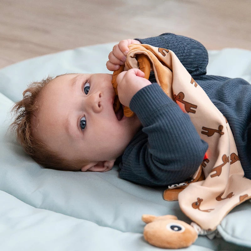 De mindste kan putte med denne søde Raffi nusseklud og udforske de sensoriske detaljer, Raffi-printet samt forskellige teksturer på bideringen. Nussekluden vil gøre din baby tryg og rolig, og være en hyggelig putteklud når det er sovetid. Den søde silikone bidering med giraf ører og forskellige teksturer, der stimulerer barnets sanser og beroliger kløende gummer, kan også bruges for sig selv. En praktisk Velcro clip og elastik-loop kan holde styr på både sutter med og uden hank. En sutteklud er en rigtig baby must-have. Denne, i mustard-farvede nuancer, har et sødt giraf print og farverige mærker, der er hyggelige for små fingre at nusse med.