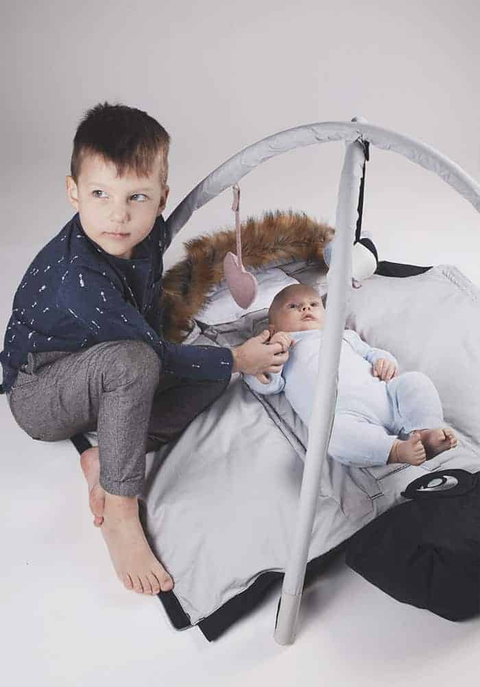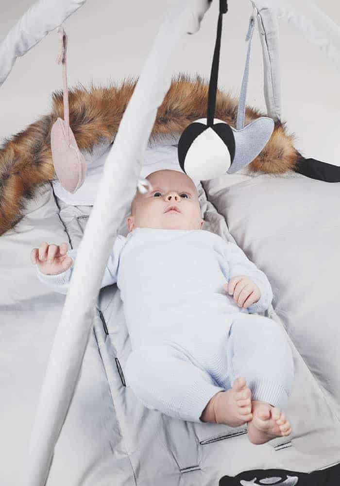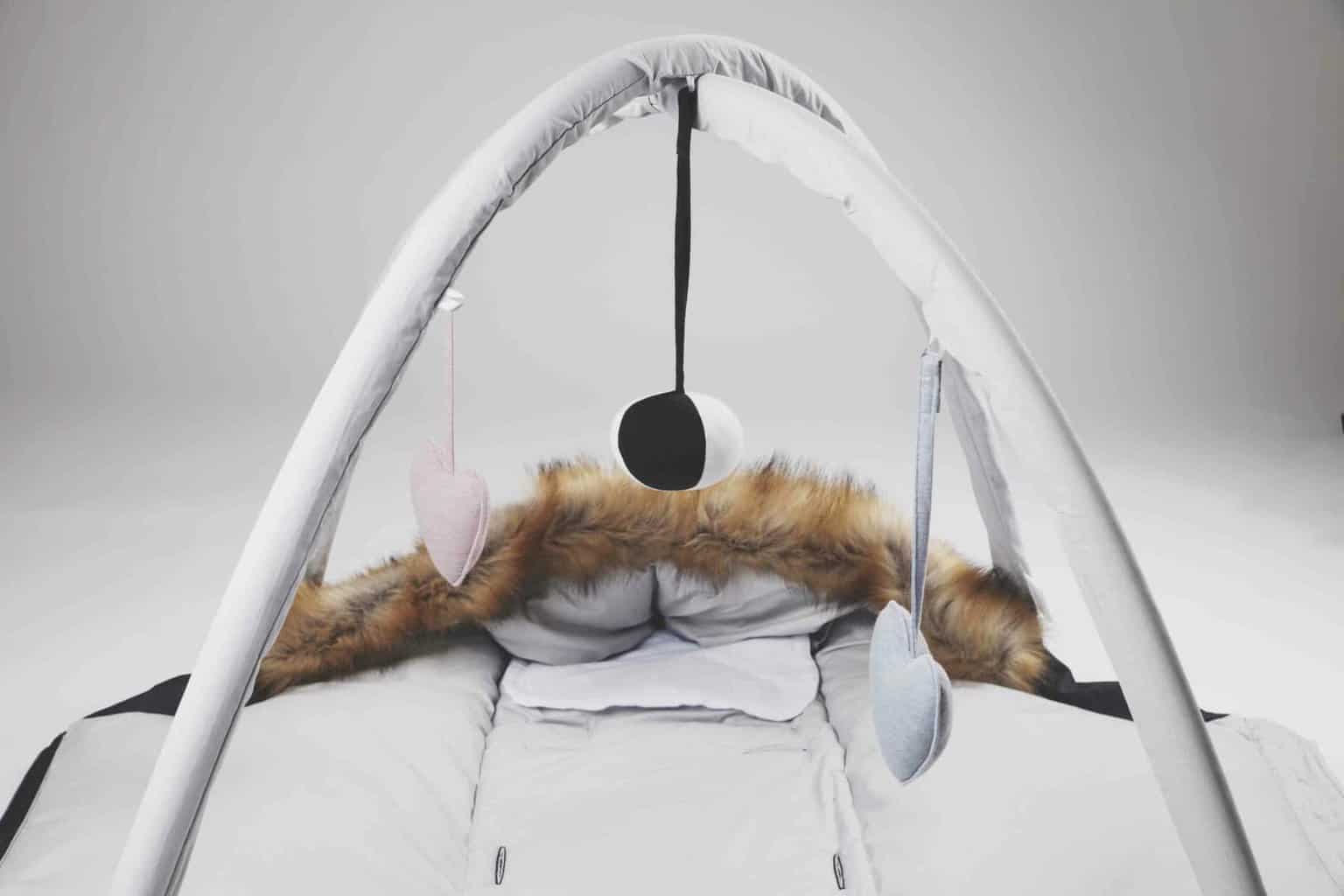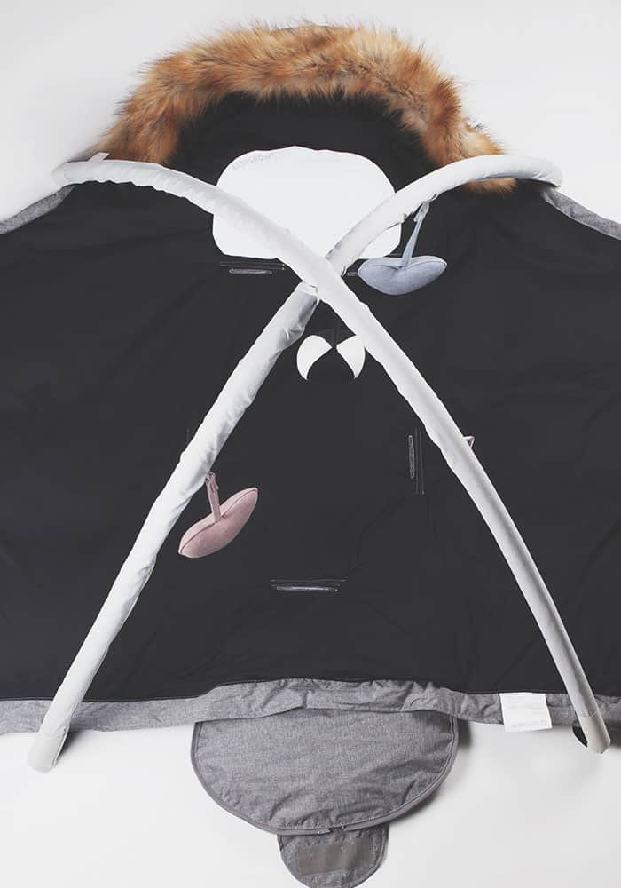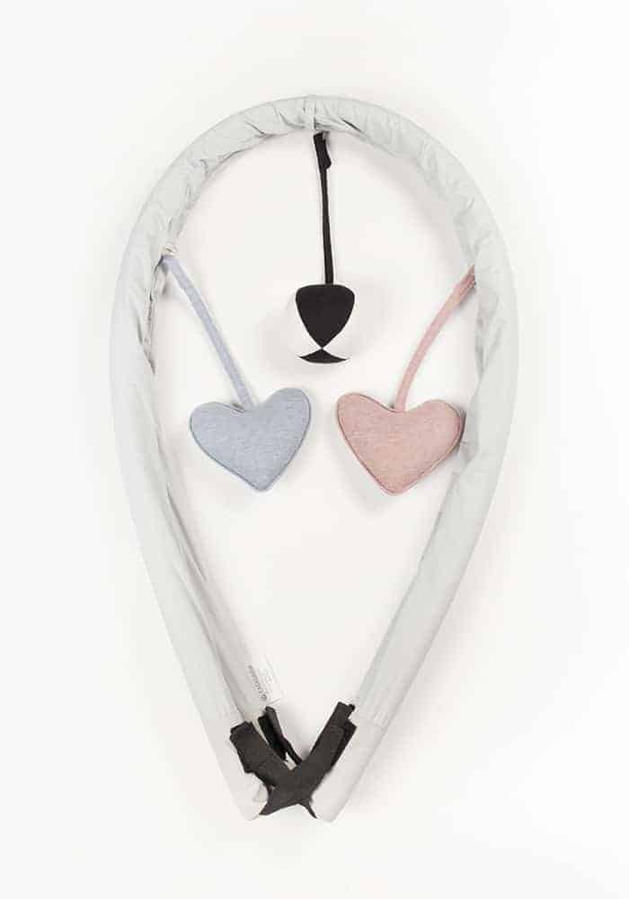 Legetøjsstativ, der passer til Easygrows køreposer, når køreposen foldes ud og bruges som legetæppe. Tilpasset model HOOD, HOOD W, HOOD Norse, Exclusive, NORD og Nature. Til leg og stimulering af barnets sanser og motorik. Leveres med 3 stk. legetøj i blødt stof, der nemt kan sættes på og fjernes igen – bold med klokke og 2 hjerter.