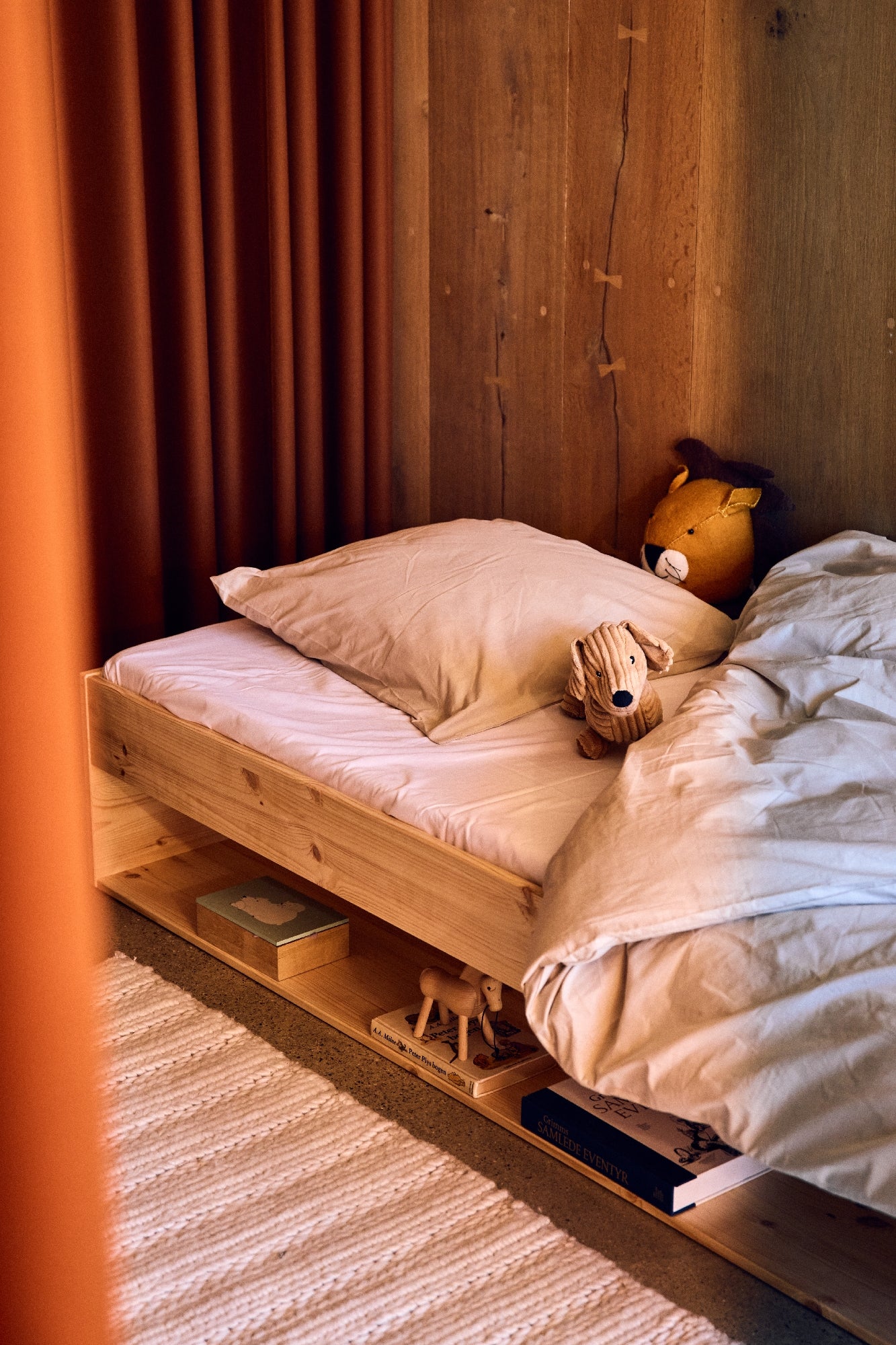 Omhyggeligt designet med praktisk anvendelse for øje, har denne seng en rummelig hylde nedenunder, der er perfekt til opbevaring af bøger, tekstiler, legetøj eller andre kære ejendele, som dit barn ønsker at have tæt på. Denne smarte udnyttelse af plads hjælper med at holde rummet ryddeligt og giver samtidig børnene nem adgang til deres yndlingsting.