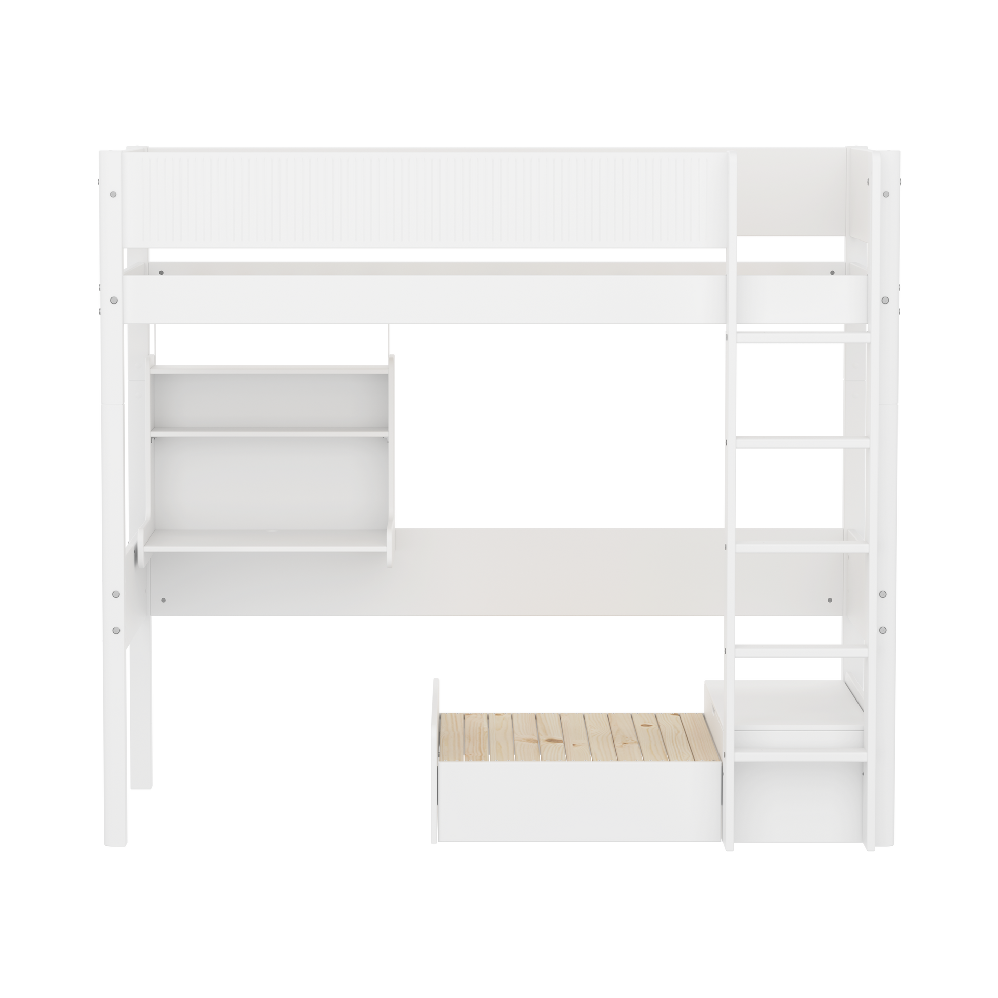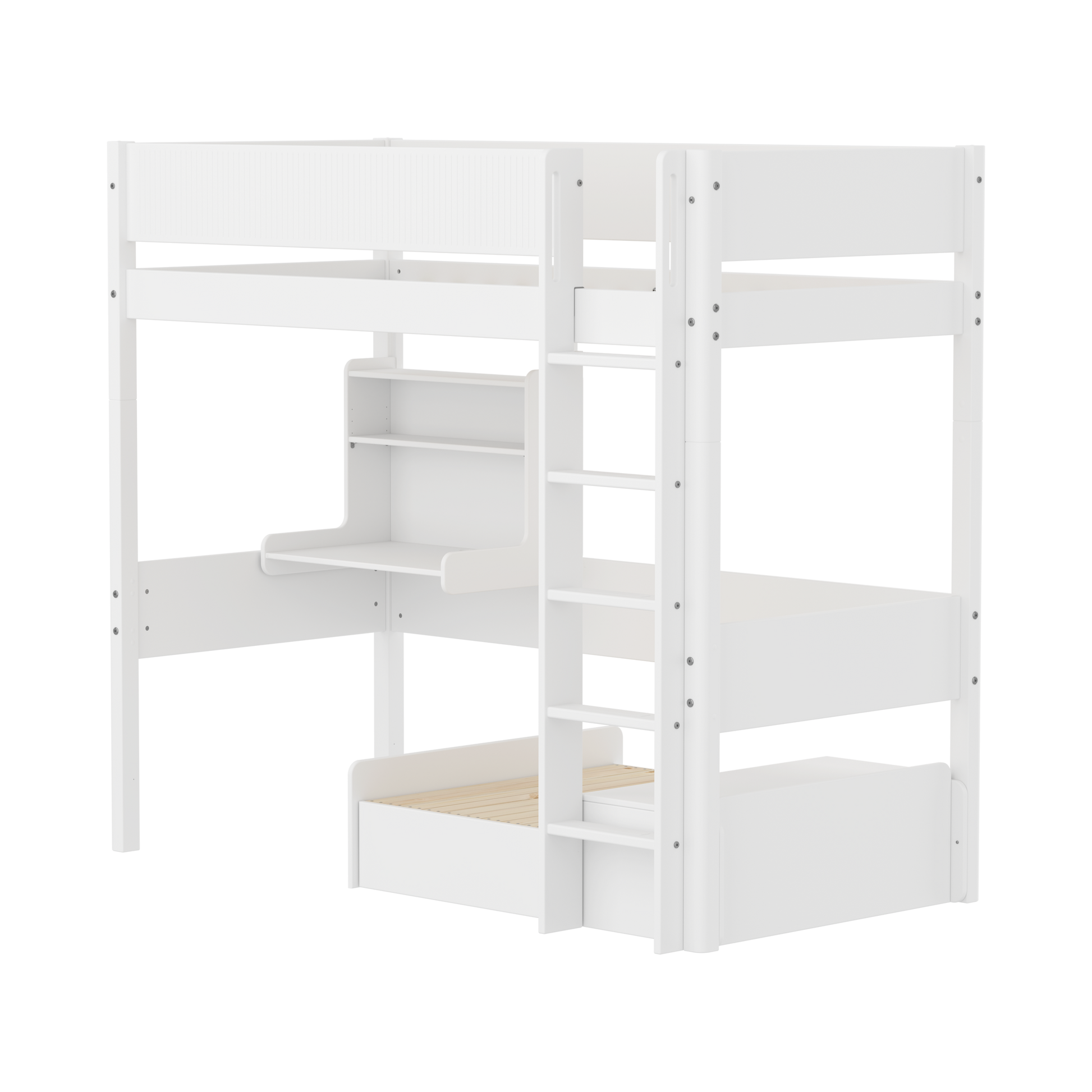 FLEXA WHITE Casa højseng med integreret sengemodul og click-on-skrivebord. Den perfekte seng til teenagere, som har brug for ekstra plads til et skrivebord under sengen og til overnattende venner.
