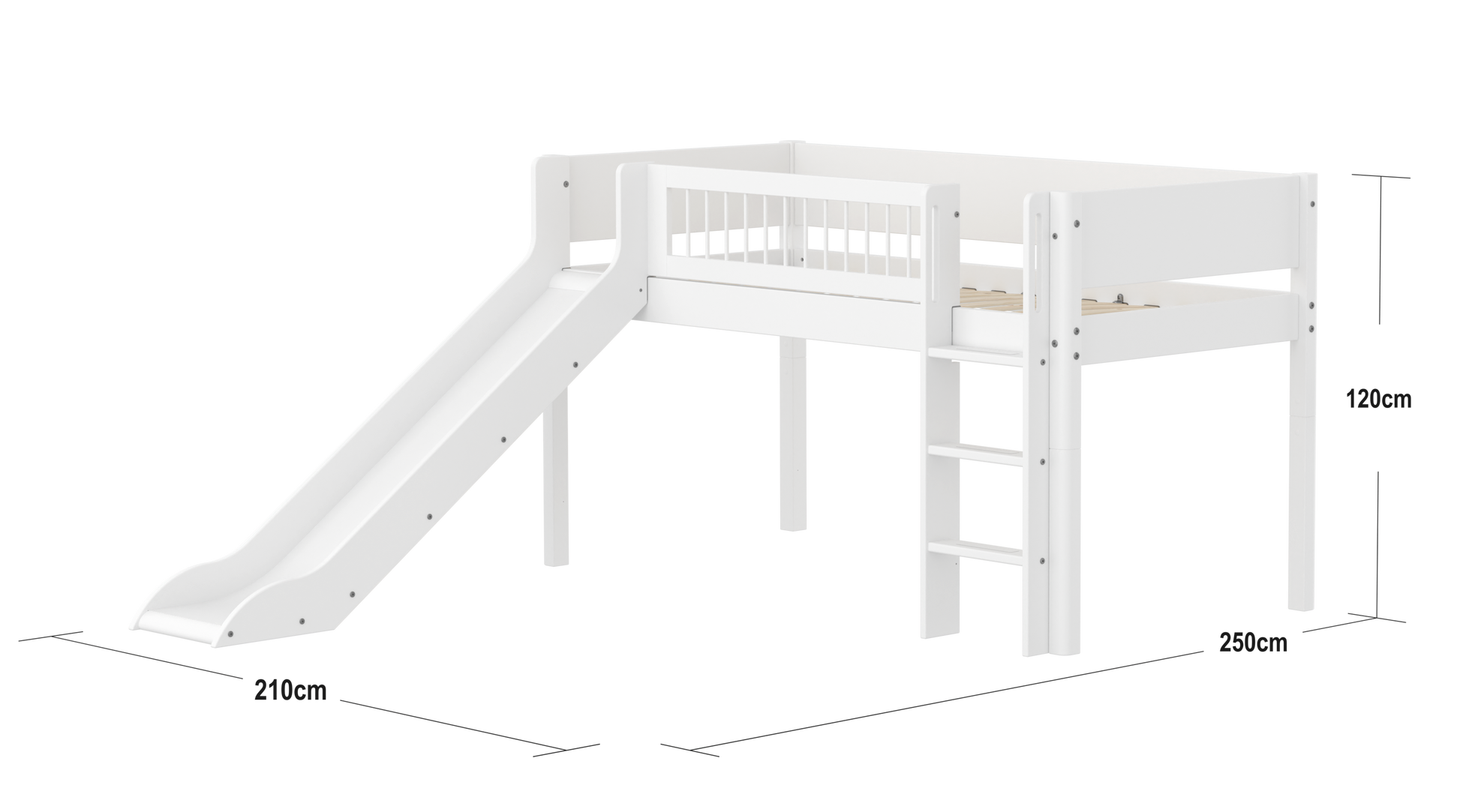 WHITE serien vokser med dit barn. Hvis du fjerner rutsjebanen og stigen og sætter korte ben på den halvhøje seng, kan du lave den om til en enkeltseng. Og med høje ben kan du lave den om til en højseng.