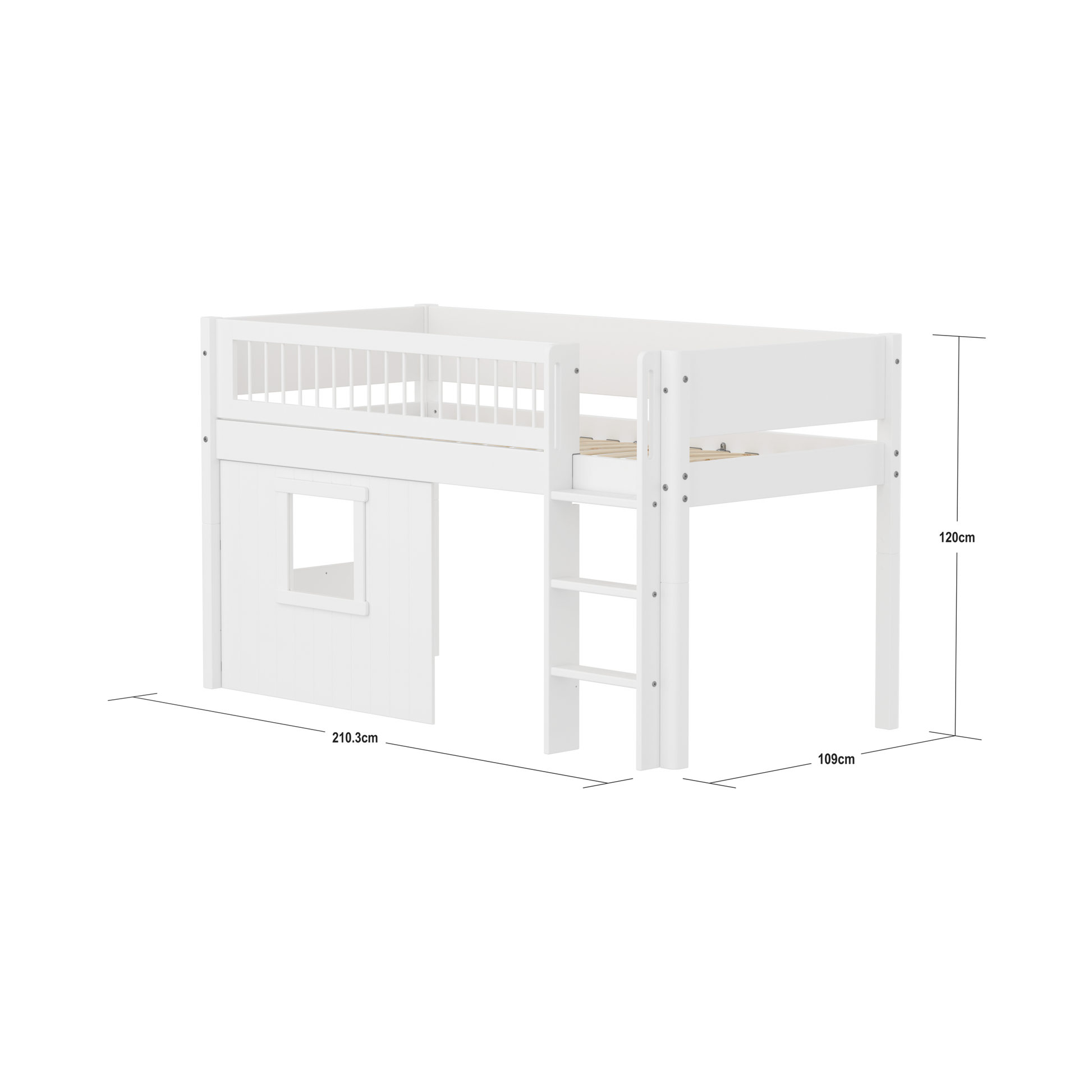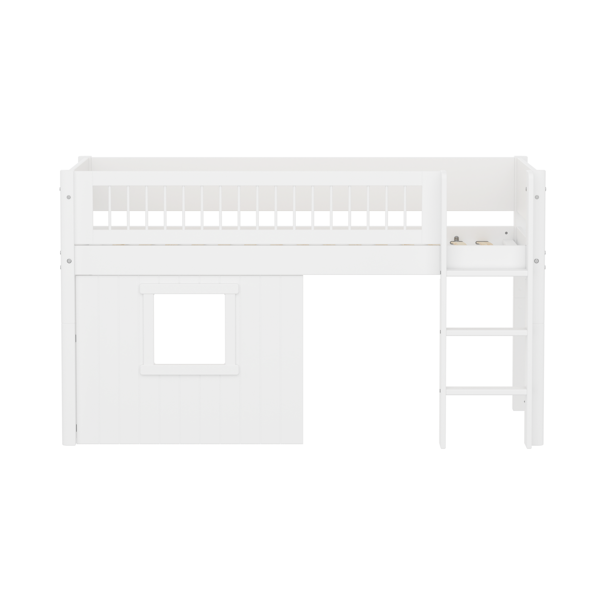 Forestil dig alt det sjov, de kan få ud af at lege hus, købmand eller gemmeleg. I en halvhøj WHITE-seng med træhytte-sengefronter er mulighederne for leg og læring uendelige.