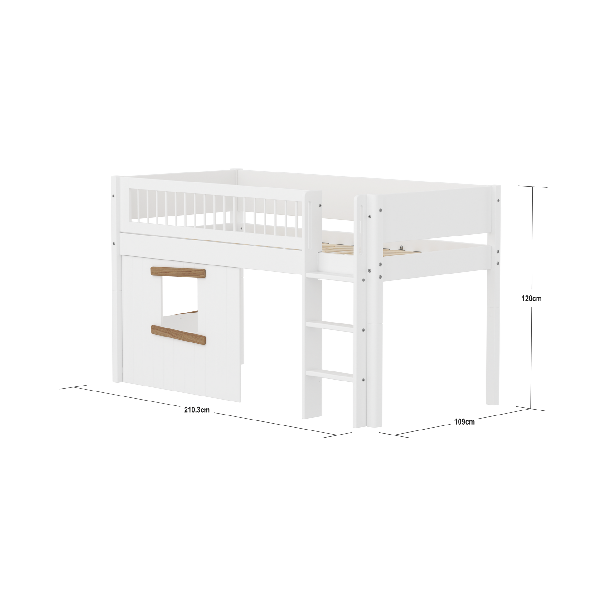 FLEXA WHITE Halvhøj seng 120 cm med stige, crossbar sengehest og træhytte-sengefronter 90x200 cm - Hvid/eg