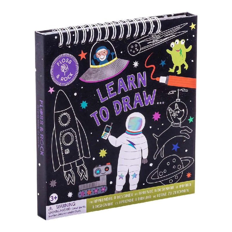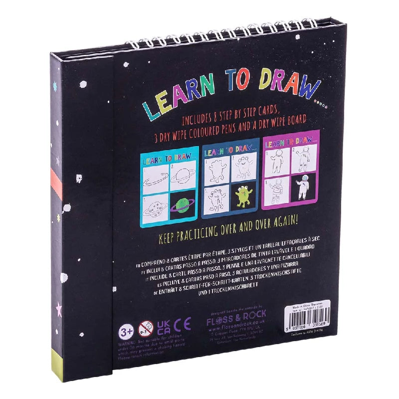 Floss & Rock Lær at tegne inkluderer 3 penne med viskelæderlåg og 8 trin for trin billedkort, der lærer dig at tegne. Billederne er spiralbundet, så de er nemme at vende til det næste med en tom side, så du kan lave dit mesterværk! Fortsæt med at øve dig igen og igen!