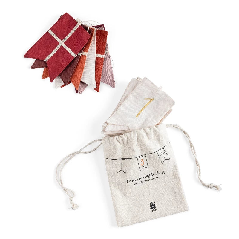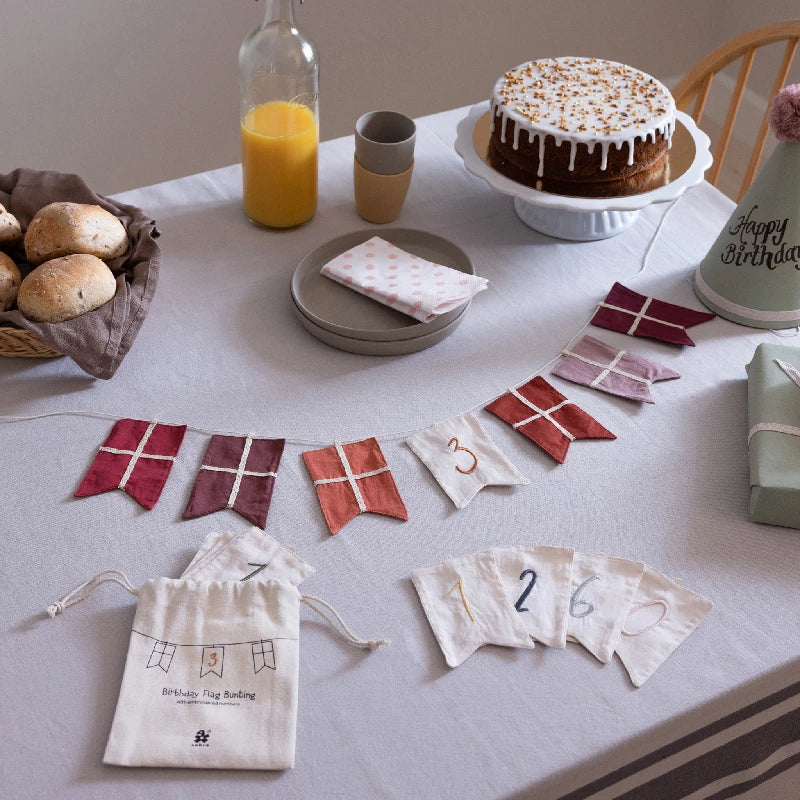 Fødselsdagsflagranke i økologisk bomuld med 11 udskiftelige tal-flag og 6 dannebrogsflag i afstemte røde nuancer.