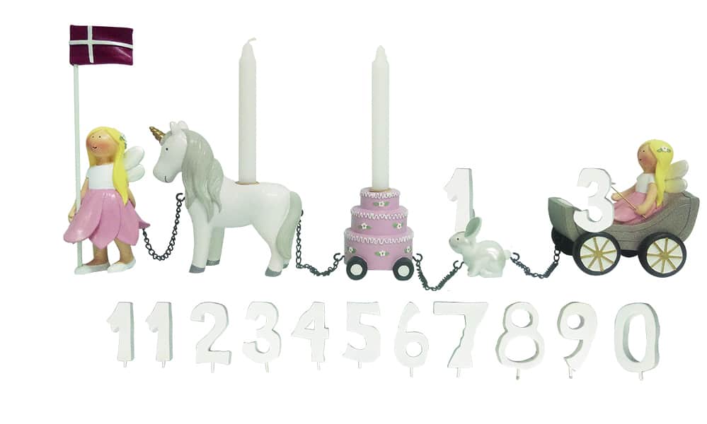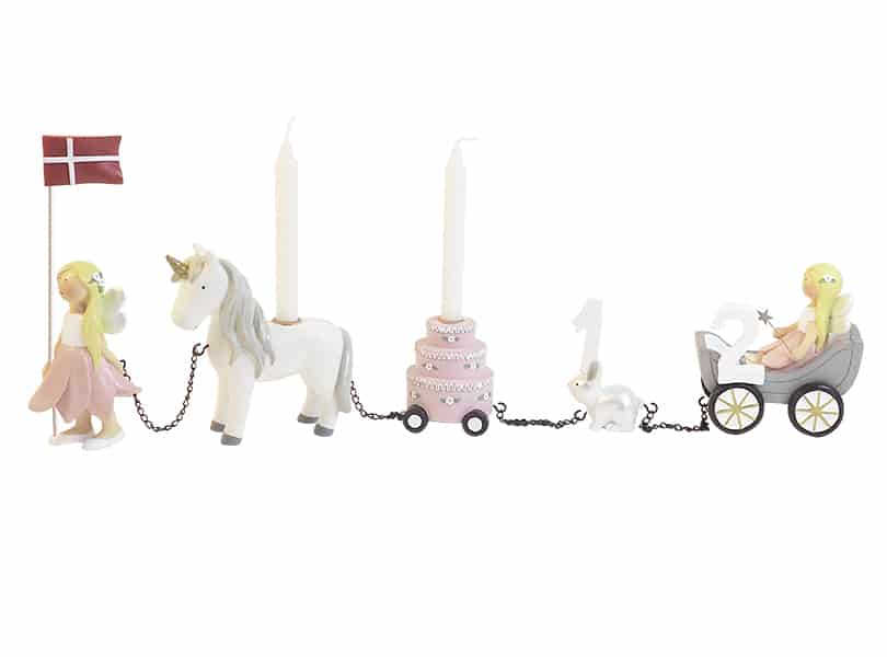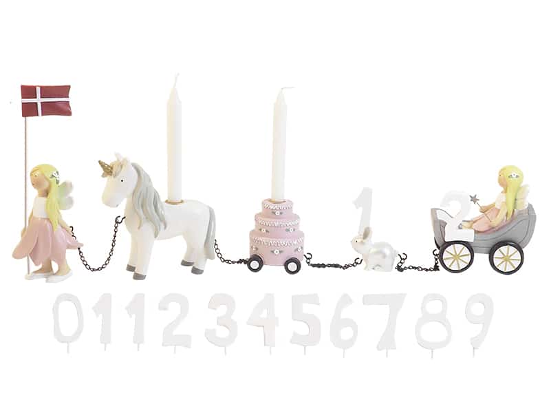 Fødselsdagstog, blomsterfeer m. 11 tal. Håndmalet. Polyresin materiale. Der er plads til to talnumre i toget. Inkl. flag og flagranke.