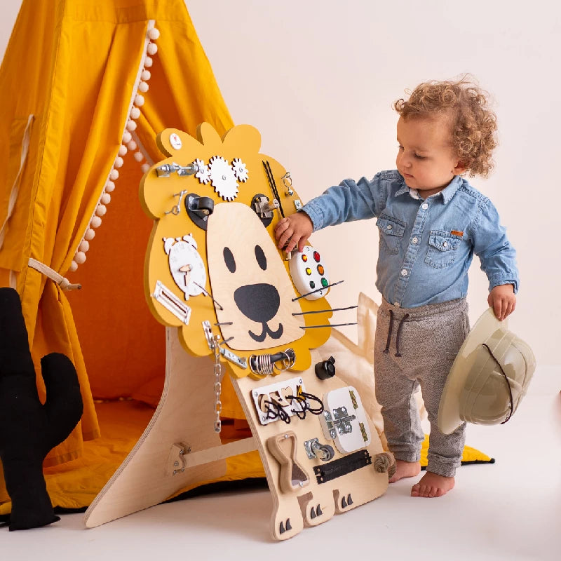 Aktivitetstavlen måler 80x62 cm. Fås både som hængende samt ståenden (den stående variant kan også hænge). Den har beslag på bagsiden til vægmontering.