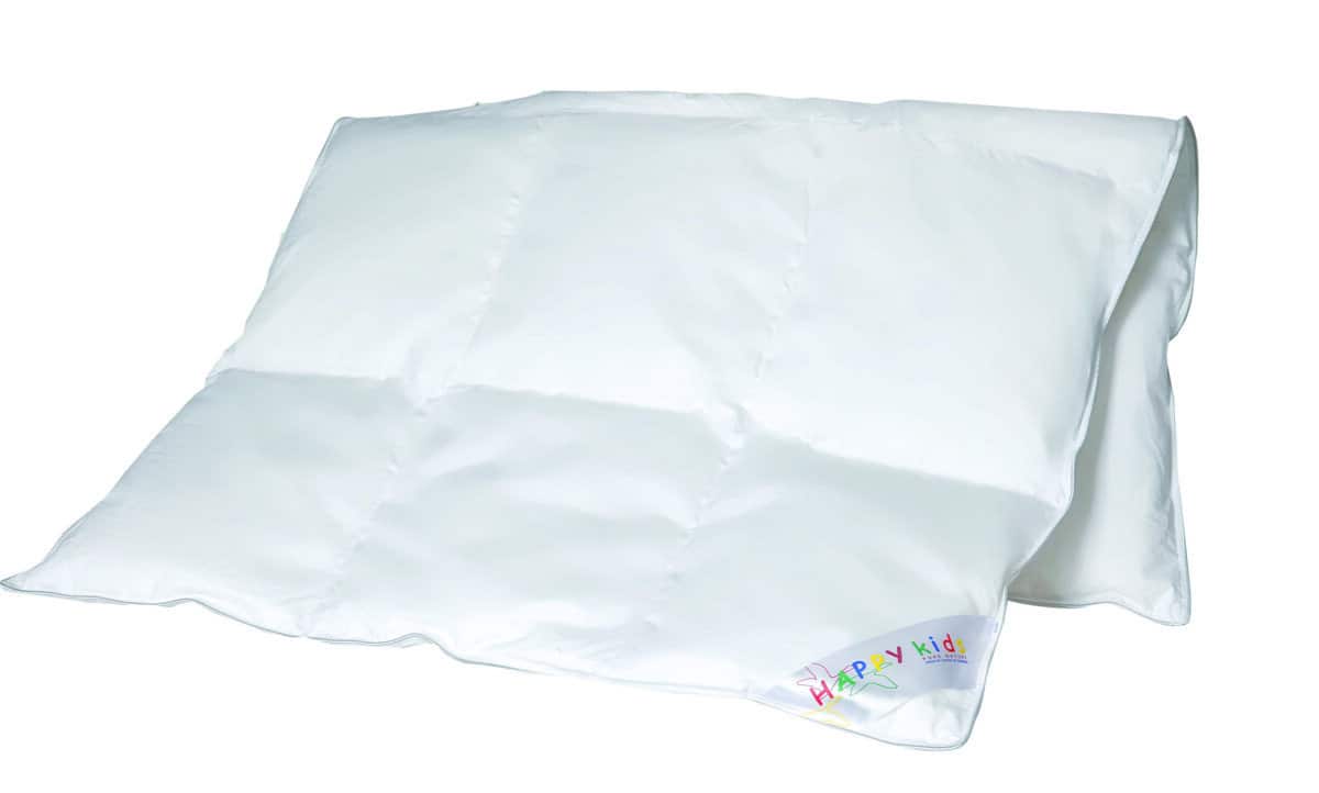 Happy Kids helårs baby dyne. Lækker helårs baby dyne i bæreevne 10. Mål 67x100 cm med 140 gram europæiske andedun 90% og småfjer 10%. Våret er Bomulds Cambric. Kan vaskes på 60 grader skånevask med dunvaskemiddel og tørretumbles
