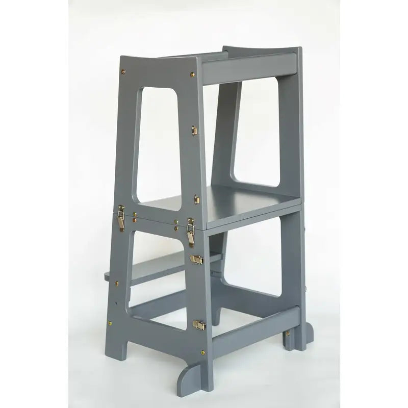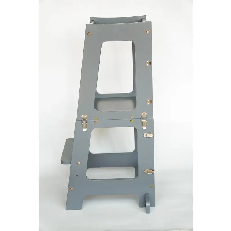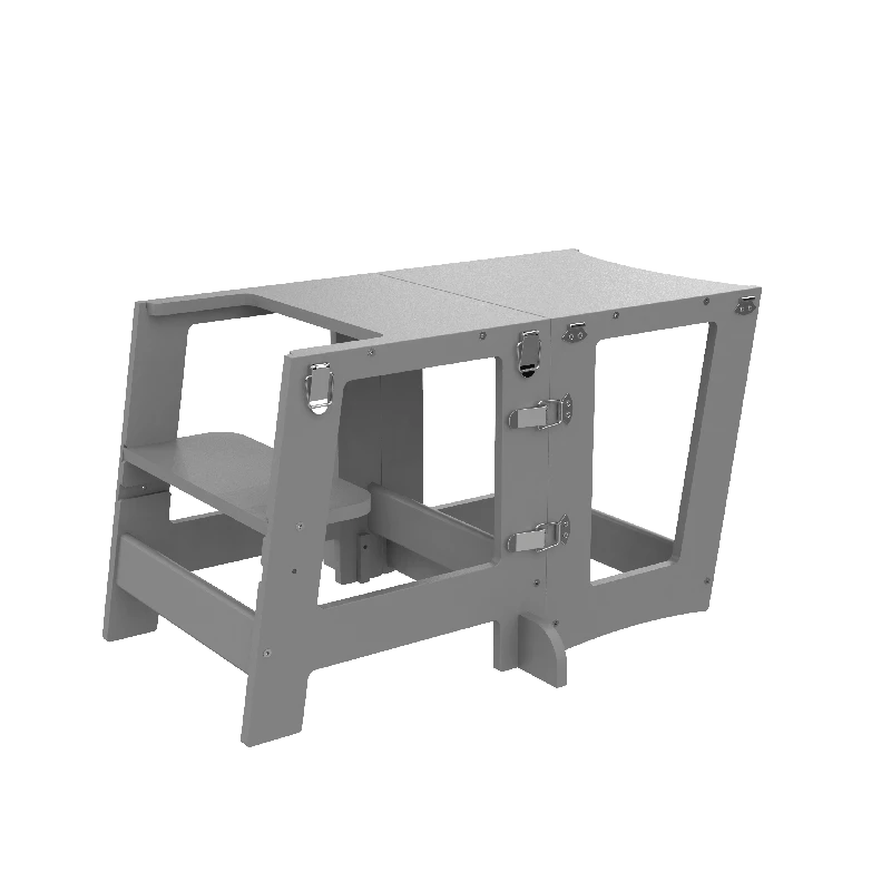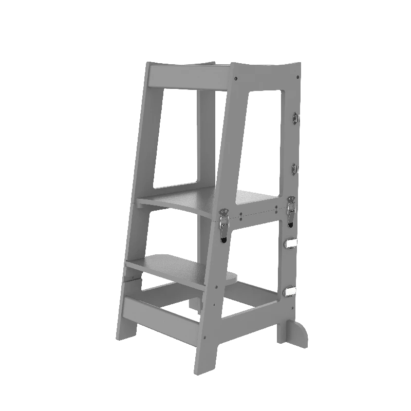 Derudover kan det sammenklappelige læringstårn også fungere som bord og stol, da tårnet kan indstilles i flere forskellige højdeniveauer for at matche dit barns udviklingstrin. Tårnet er designet med vores intelligente og innovative klik-system, hvilket gør det nemt at samle, adskille og justere efter dit barns behov.
