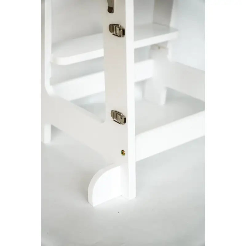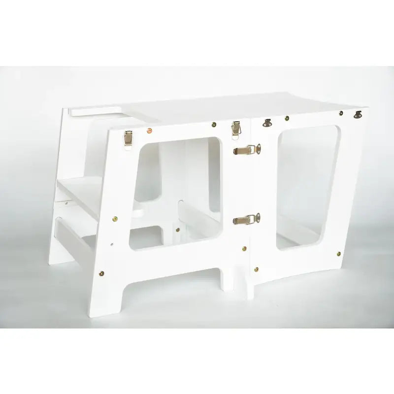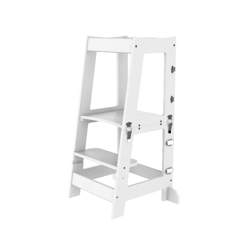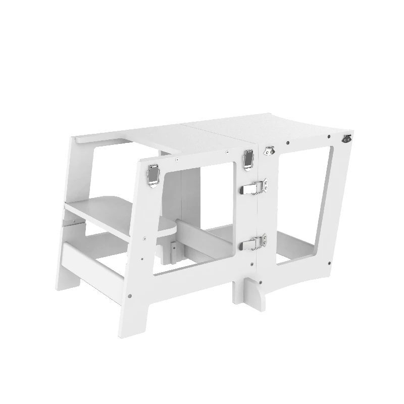 Derudover kan det sammenklappelige læringstårn også fungere som bord og stol, da tårnet kan indstilles i flere forskellige højdeniveauer for at matche dit barns udviklingstrin. Tårnet er designet med vores intelligente og innovative klik-system, hvilket gør det nemt at samle, adskille og justere efter dit barns behov.