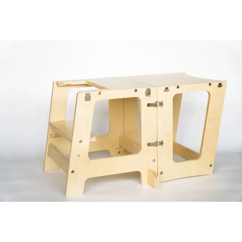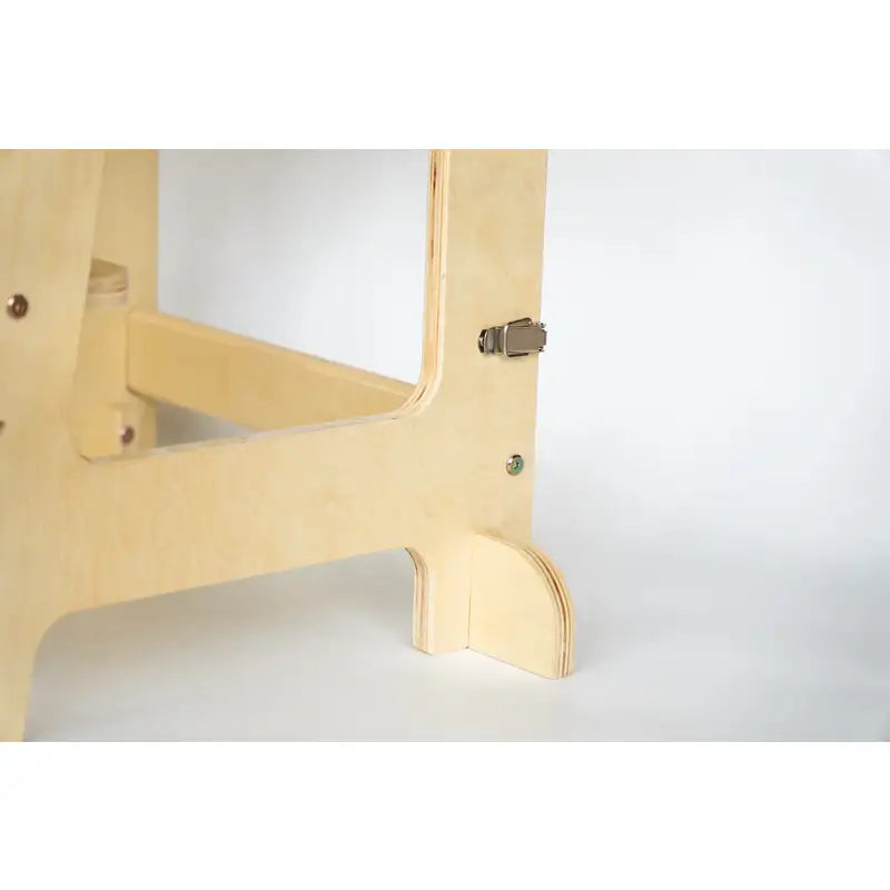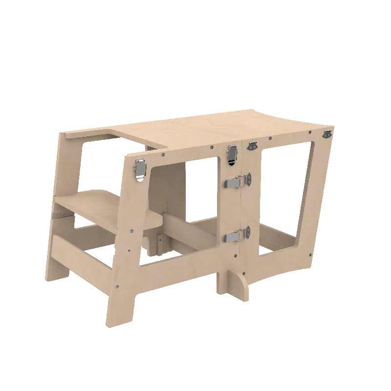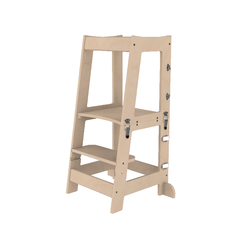 Derudover kan det sammenklappelige læringstårn også fungere som bord og stol, da tårnet kan indstilles i flere forskellige højdeniveauer for at matche dit barns udviklingstrin. Tårnet er designet med vores intelligente og innovative klik-system, hvilket gør det nemt at samle, adskille og justere efter dit barns behov.