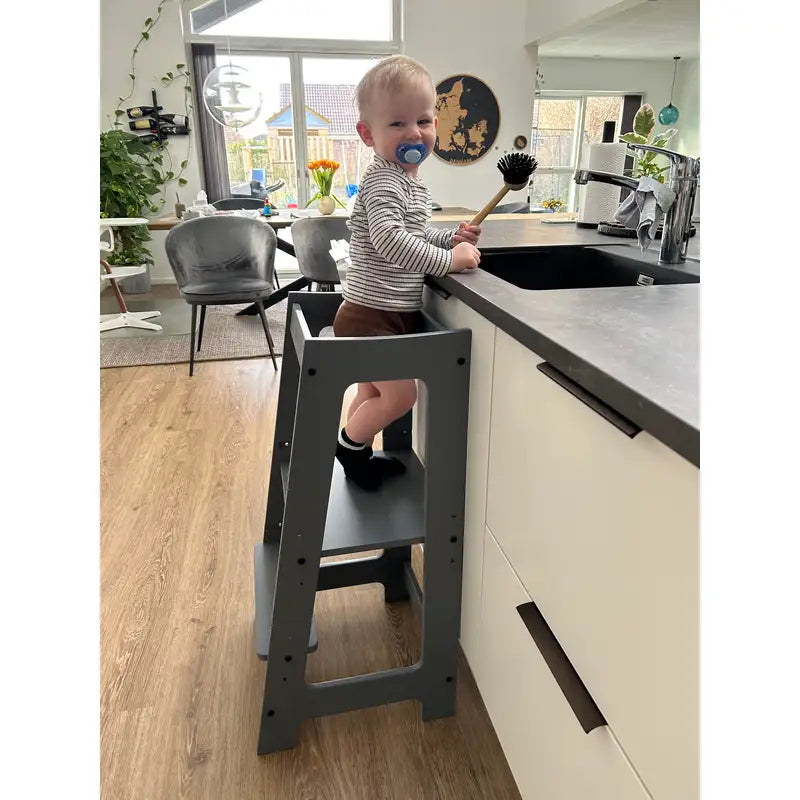 Ståpladen på læringstårnet kan også justeres i højden, så den passer til alle bord- og barnehøjder, og på den måde kan tårnet vokse med barnet.