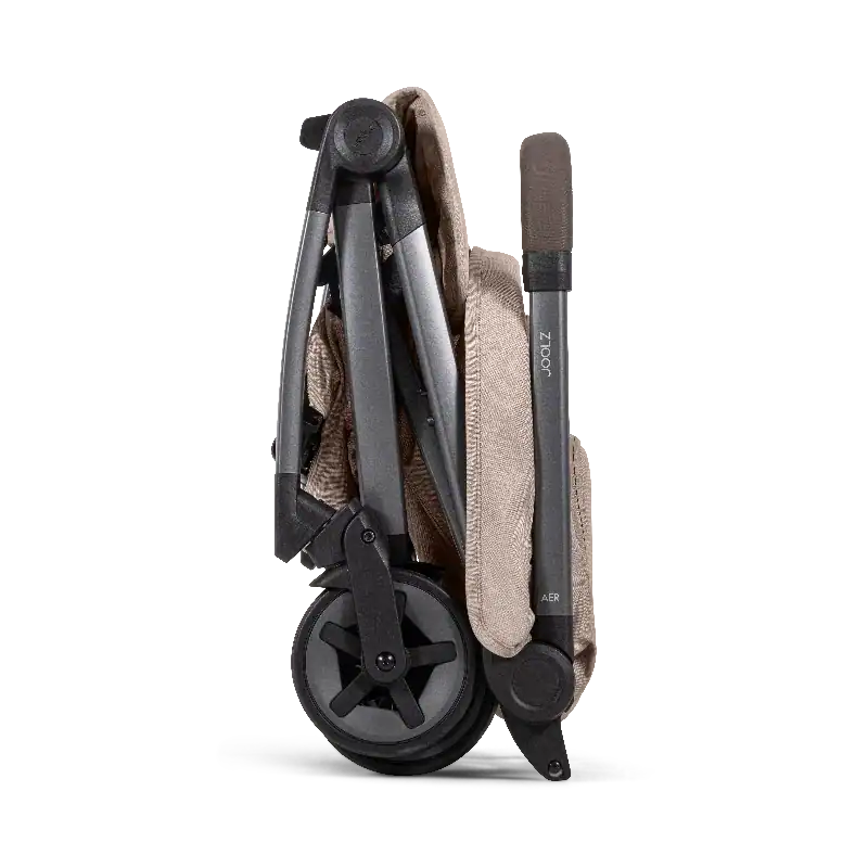 Glem besværet. Med Joolz Aer² folder du nemt vognen sammen med én hånd, og den står selv, når den er foldet. Den automatiske transportlås og den integrerede skulderrem gør den ideel til rejseliv og opbevaring på farten.