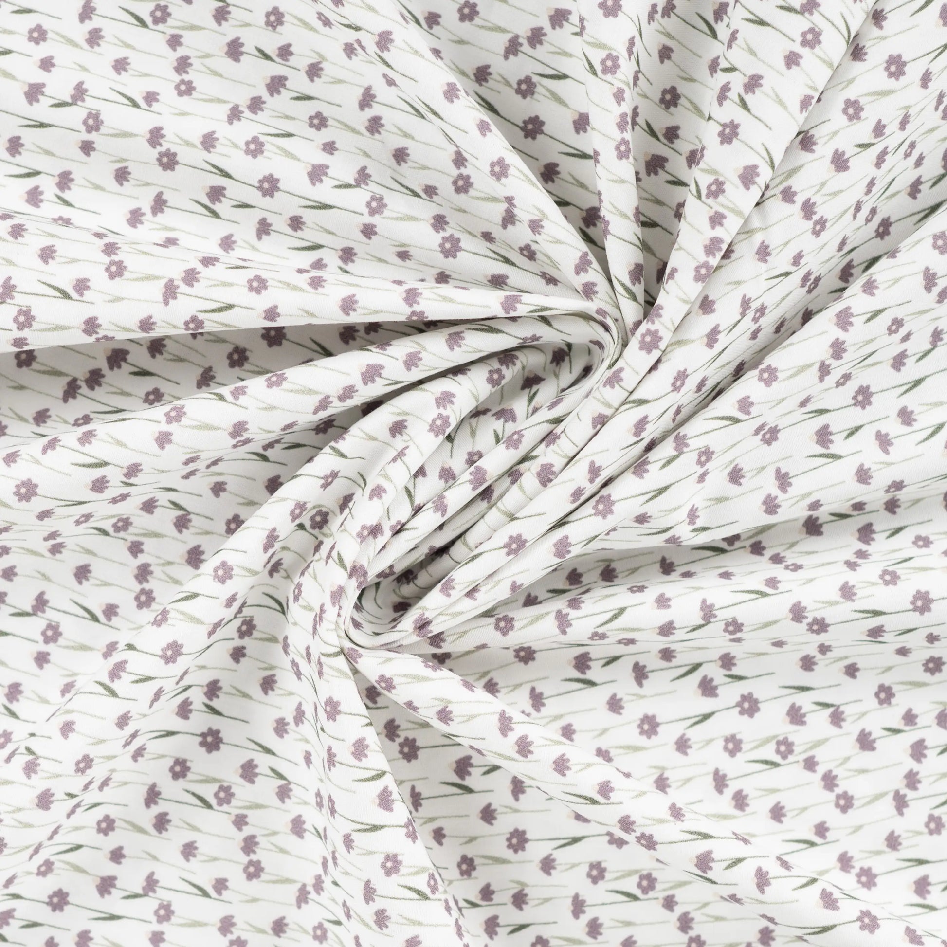 Junior sengesæt i et klassisk hvidt design pyntet med de fineste motiver af lavendel farvede blomster og grønne grene. Sættet er lavet i en blød bomuldspoplin, stoffet er Oeko Tex certificeret og syet i Danmark.