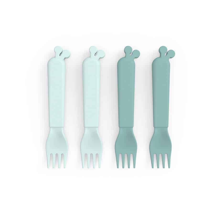 Når din tumling øver sig i at spise selv, er det godt at have rigeligt med gafler på lager. Kiddish gaflerne med Raffi ører passer perfekt i en lille hånd og gør det sikkert og nemt for din tumling at øve sig i at spise med bestik. Kiddish gaflerne er bæredygtige og produceret i Danmark. Når gaflerne er slidt op, kan de sorteres som hård plast og genanvendes til at producere nye produkter til hverdagen. En praktisk 4-pak med Kiddish gafler i to blå nuancer. Gaflerne har en mat, silkeblød overflade og passer perfekt til resten af Kiddish kollektionen.