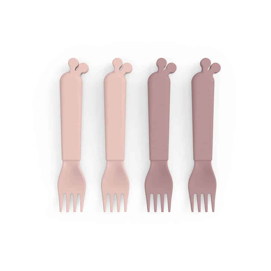 Når din tumling øver sig i at spise selv, er det godt at have rigeligt med gafler på lager. Kiddish gaflerne med Raffi ører passer perfekt i en lille hånd og gør det sikkert og nemt for din tumling at øve sig i at spise med bestik. Kiddish gaflerne er bæredygtige og produceret i Danmark. Når gaflerne er slidt op, kan de sorteres som hård plast og genanvendes til at producere nye produkter til hverdagen. En praktisk 4-pak med Kiddish gafler i to pudderfarvede nuancer. Gaflerne har en mat, silkeblød overflade og passer perfekt til resten af Kiddish kollektionen.