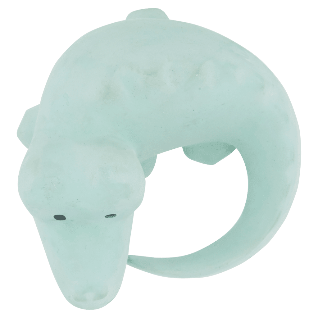 En sød lille gummi krokodille. Den er fantastisk til små ømme tænder og nemt for barnet at gribe og klemme om. Produktet har en lille klokke, der laver små ranglelyde som vil glæde og underholde de små. Produktet er Fremstillet af naturgummi, der høstes fra gummitræer, med en 12-årig livscyklus. BPA og phtalates fri.
