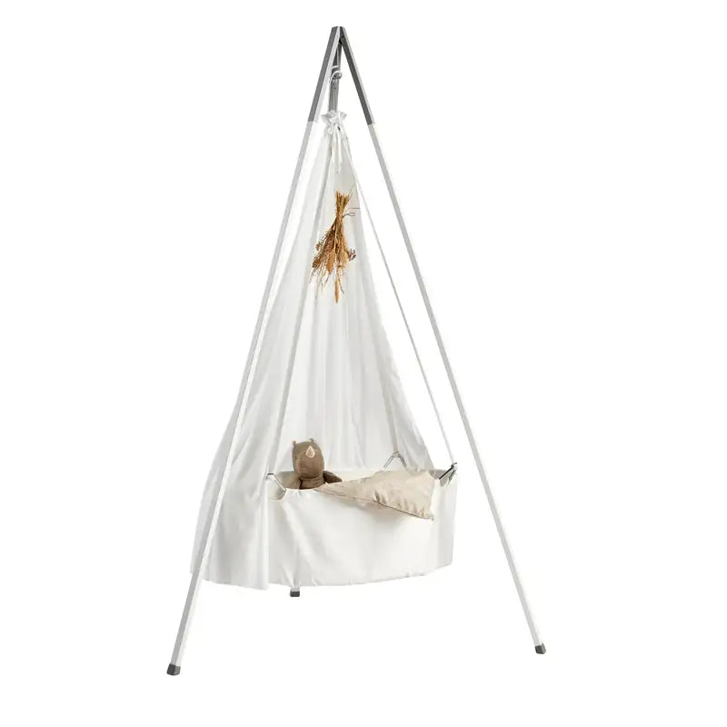 Leander Vuggestativ til Leander Vuggen er let at flytte rundt i rummet og kan klappes sammen når man ikke bruger det. Af sikkerhedsmæssige årsager bør stativet kun benyttes sammen med Leander vuggen. Ophængning af andre produkter eller genstande f.eks. fjedre i stativet sker på eget ansvar.
