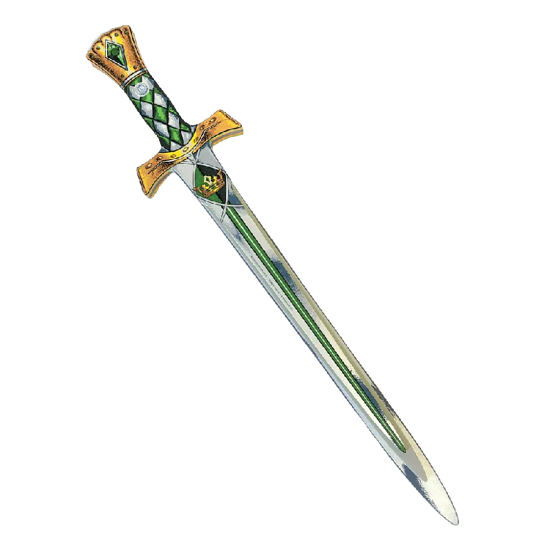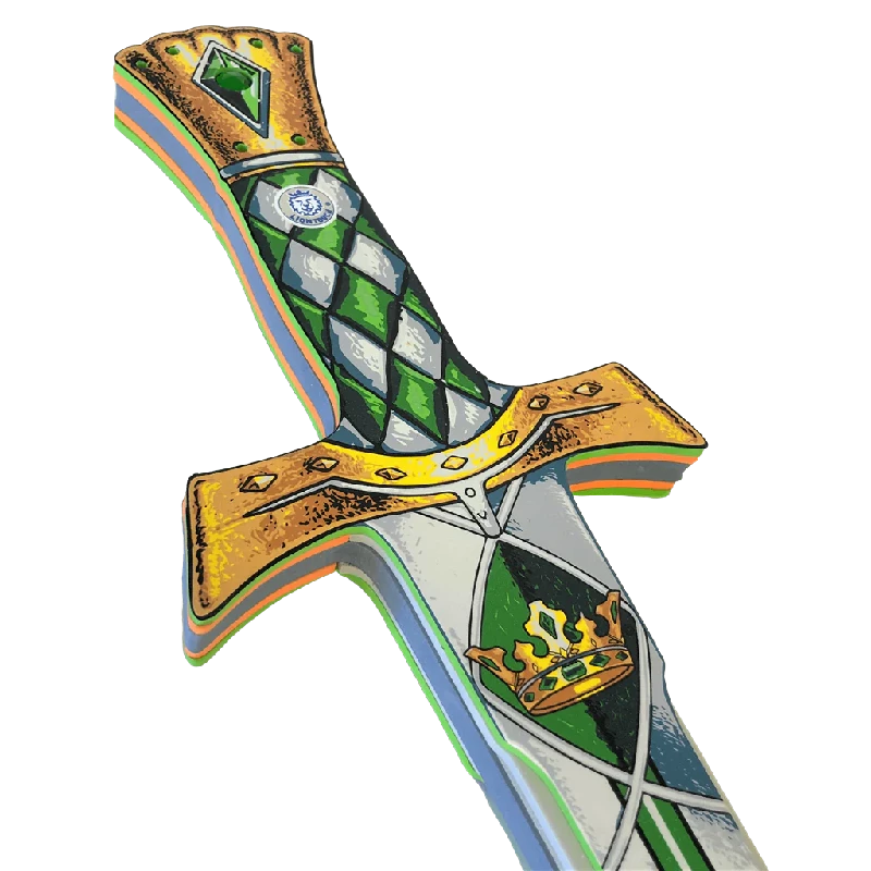 Sværdet er lavet i let skum med et design, der efterligner et klassisk riddervåben med detaljer som en gylden parerbøjle og et læderlook på håndtaget med engelsk tern-mønster. Det ligger godt i hånden og er sikkert at bruge til fantasifuld leg og ridderdueller.