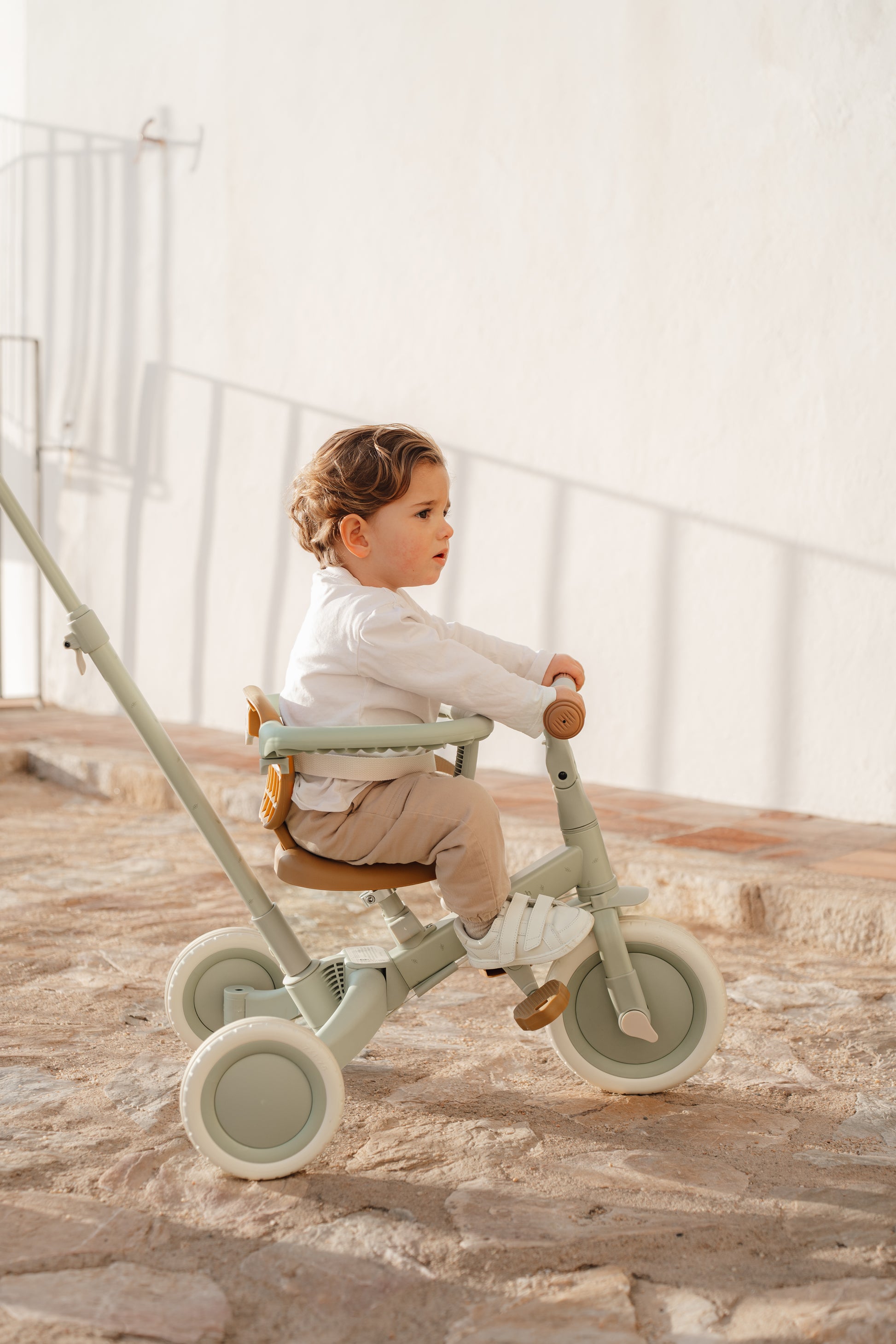 4 i 1 cyklen er en ideel måde at udforske det at cykle. Hvis barnet stadig er for lille til at cykle eller gå, kan mor eller far skubbe den tilhørende skubbestang. Barnet sidder helt sikkert i selen og sikkerhedsringen. Skubbestangen og sikkerhedsringen kan nemt fjernes. Denne model kan nemt konverteres fra en trehjulet cykel til en balancecykel ved at folde begge baghjul indad. Det gør overgangen til en cykel med pedaler nemmere. Pedalerne er nemme at montere og kan bekvemt opbevares på stellet under sadlen. Sadlen og styret er begge justerbare, så de passer til barnets behov. 4 i 1 cyklen kan bruges til at træne dit barns koordinationsevner og dermed også lære barnet at bevare en god balance.