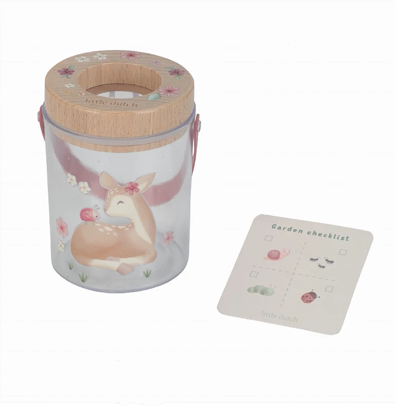 Oplev insekternes verden med denne praktiske insektkrukke! Trælåget er udstyret med et forstørrelsesglas, så du tydeligt kan se de mindste detaljer. Låget kan nemt tages af, og krukken er dekoreret med muntre Fairy Garden-illustrationer. Der medfølger et insektkort, så man kan krydse alle insekterne af. Den gennemsigtige plast gør, at man kan se insekterne fra alle sider, og lufthullerne sørger for ventilation. Perfekt til nysgerrige børn, der gerne vil udforske naturen!
