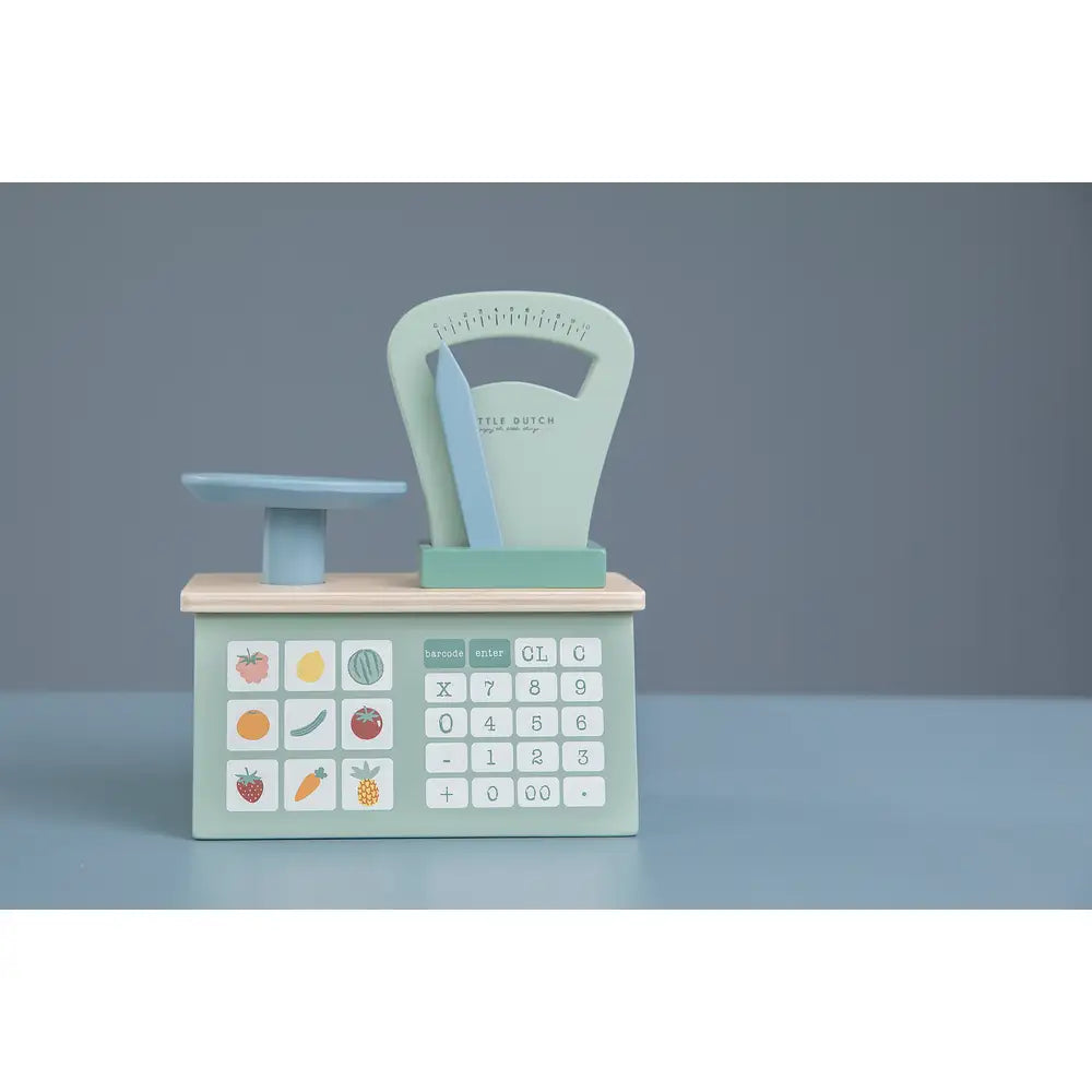 Denne fine Little Dutch vægt i træ findes i en smuk mint farve. Vægten er en must-have til enhvert køkken eller markedsbod.