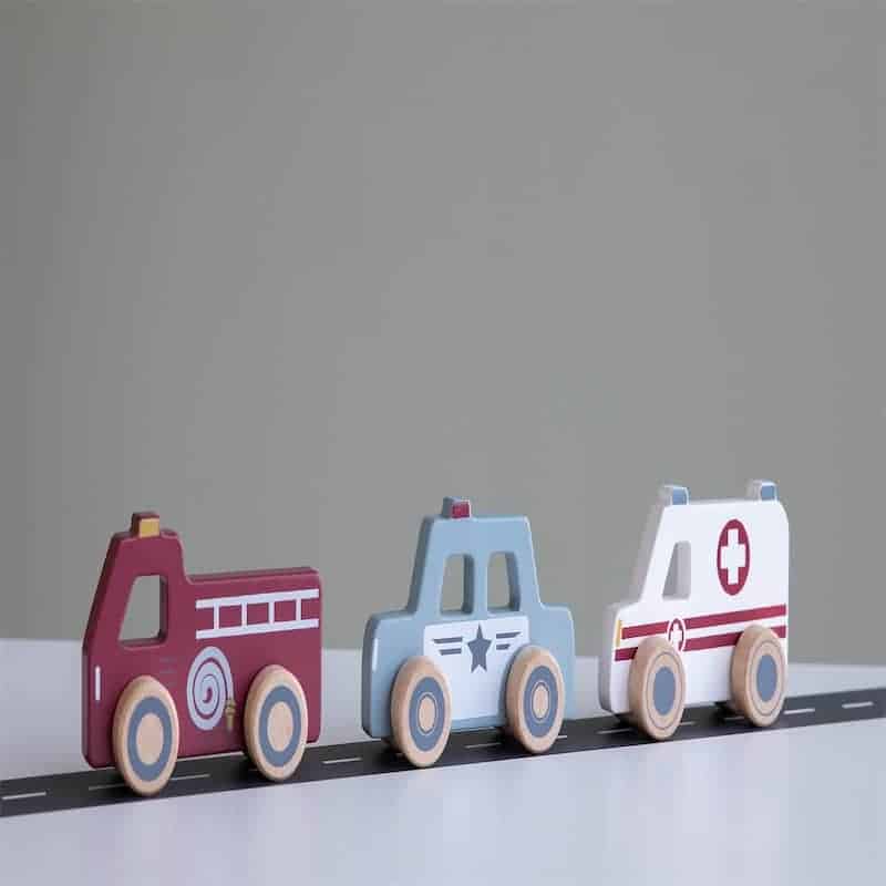 "baa-buu! Har nogen brug for hjælp? Little Dutch beredskabet er på vej! Med disse særlige køretøjer lærer børn at arbejde sammen og tilbyde hjælp til andre gennem rollespil. Sættet består af en ambulance, politibil og brandbil lavet af robust træ.