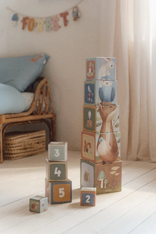 Med disse Stabelkasser kan børn på en legende måde lære at tælle til 10. Hver klods har dejlige illustrationer fra Forest Friends-kollektionen, bl.a. ræv, egern, kanin, pindsvin, ugle og en svamp. De kan stables til et højt tårn eller stilles op på en lang række. De små kasser kan placeres inde i de større, så de er nemme at rydde op. Kasserne er lavet af robust pap, så de er meget holdbare. Den mindste kasse måler 5 cm, og den største er 14 cm.