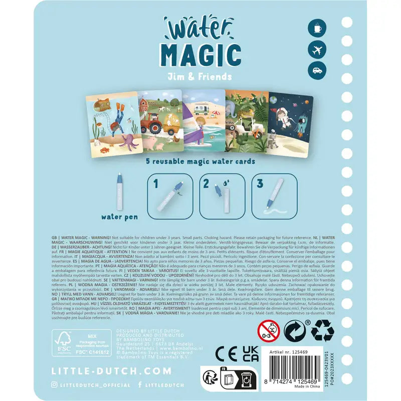Det her ligner magi! Med Little Dutch Jim & Friends malebogen kan du lave de smukkeste tegninger af Jim og hans venners forskellige aktiviteter. På hver side er et stykke allerede farvelagt så du kan se antydning af tegningen, der er gemt der. Fyld den medfølgende specialtusch med vand og begynd at tegne. Når der kommer vand på siden, dukker de smukkeste fineste tegninger op. Når siden tørrer, kan du lave tegningen igen og igen.