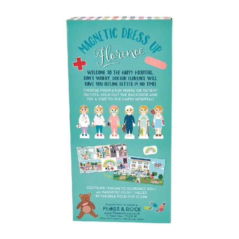 Florence elsker at lege hospital! Gør du? Klæd hende ud som læge, sygeplejerske, patient og meget mere. Med en dukke og et stativ, en vendbar baggrundsscene og 40 magnetiske stykker, alt sammen indeholdt i en smuk genanvendelig gaveæske. Dette er den perfekte gave til en spirende læge, sygeplejerske eller nogen, der bare elsker at lege hospital!