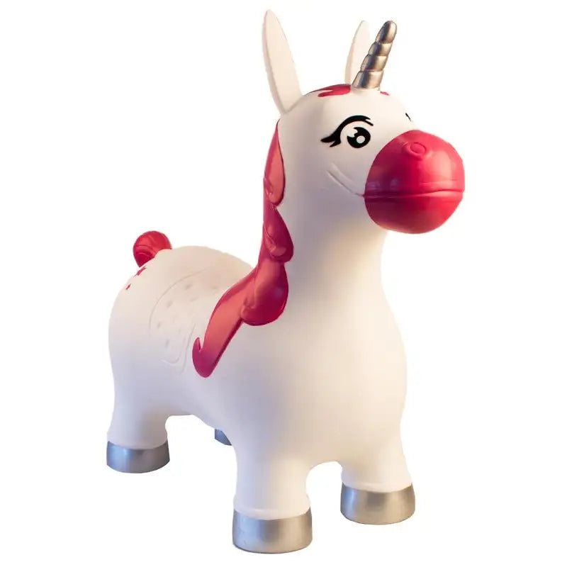 Super sød hoppe-enhjørning i hvid. Enhjørningen har rød manke og sølv hove + horn. God underholdning til de mindre børn, der kan hoppe afsted på dyret. H: 50 cm 18m+