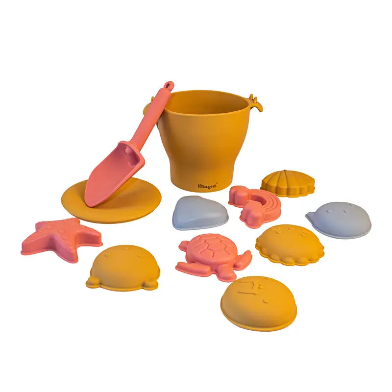 Lækkert strandsæt i silikone. Sættet består af spand med låg, skovl og 9 figurer. Figurerne er blandt andet formet som skildpadde, såstjerne, musling, regnbue, hjerte + 4 forskellige dyrehoveder. Dette strandsæt er i farven honning gul. 6m+